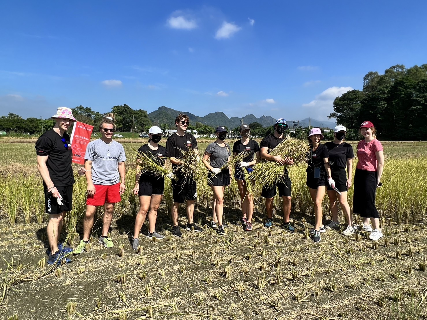 IBMBA在《金融時報》百大排名中,ESG、國際課程經驗亞洲第1、教師博士學位比例亞洲第1,突顯中山管院培育全球菁英的實力。照片為IBMBA國際生收割稻穗初體驗。