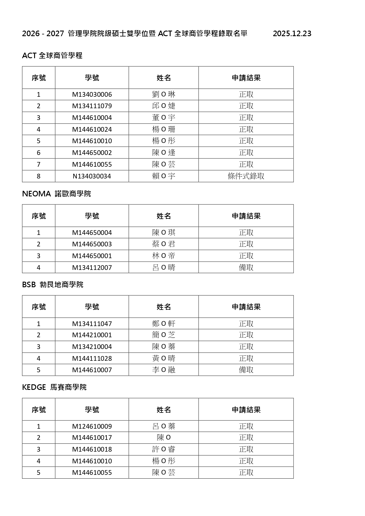 【雙學位】2026-2027 管理學院院級碩士雙學位暨ACT全球商管學程錄取名單