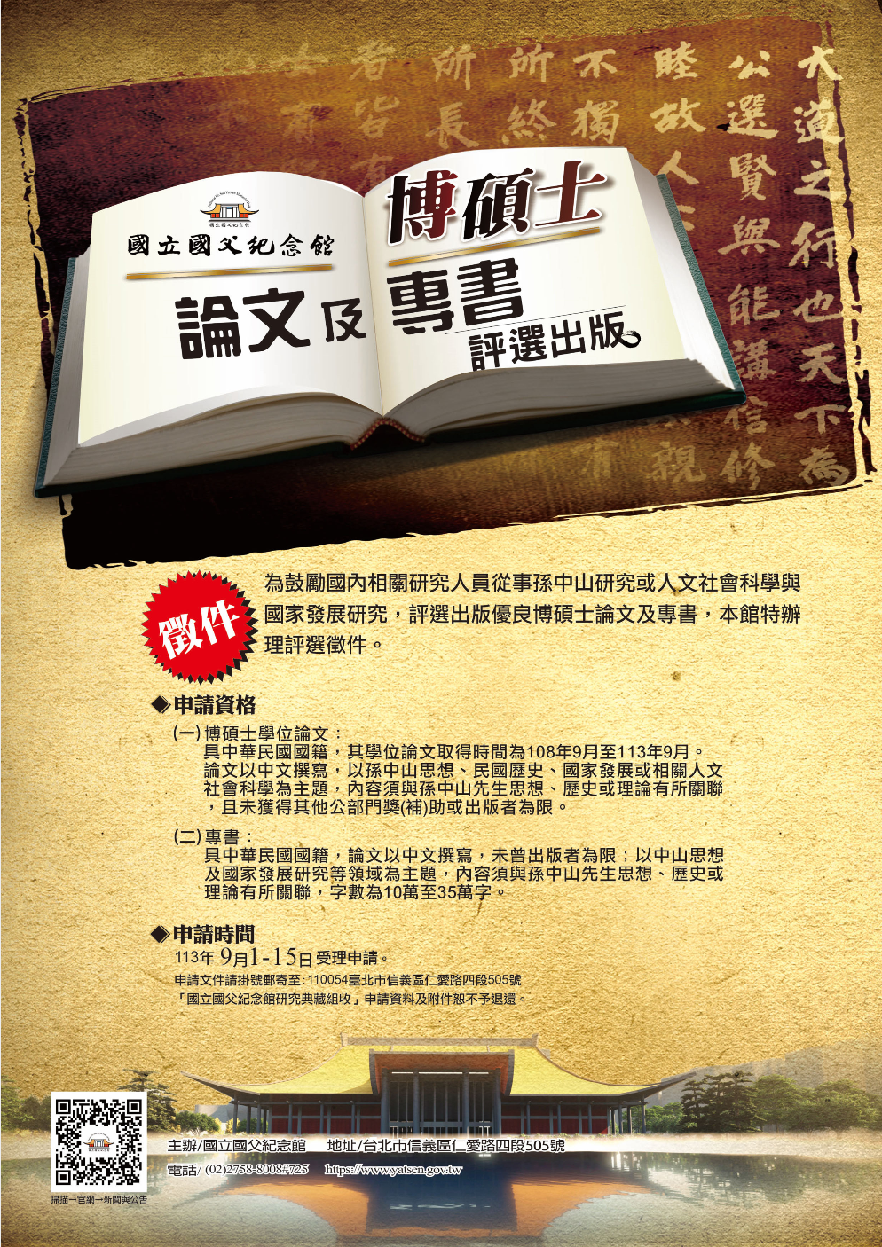 【國父紀念館】「113年國立國父紀念館評選出版博碩士論文及專書」實施計畫(9/15截止)