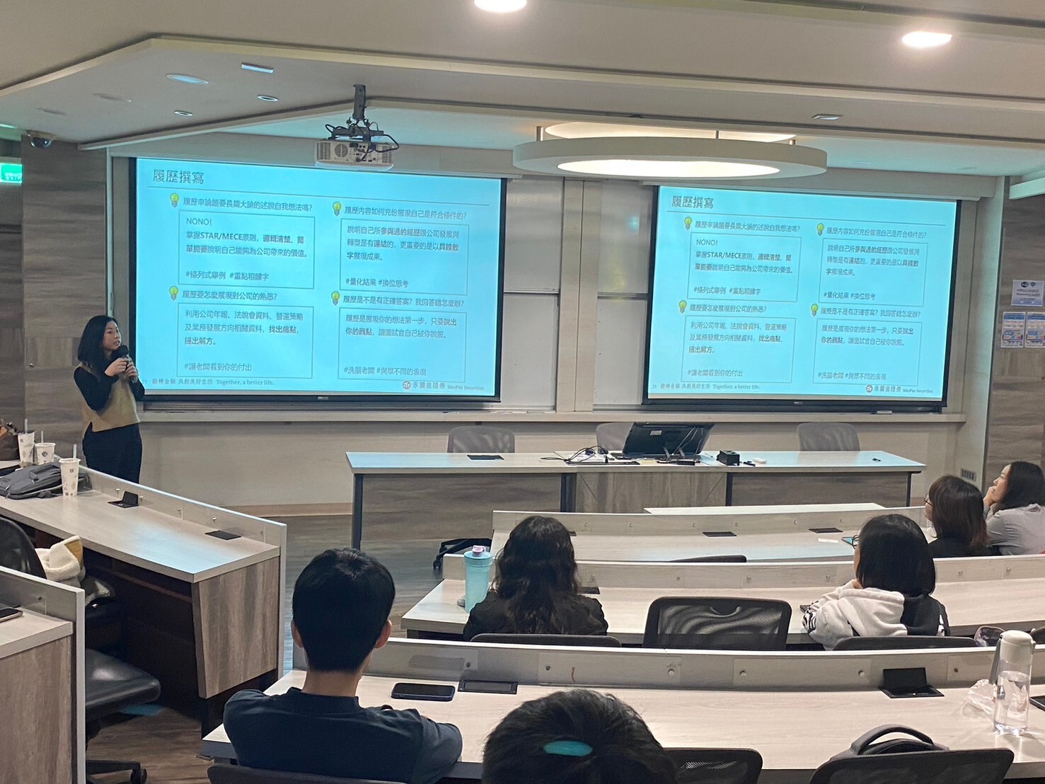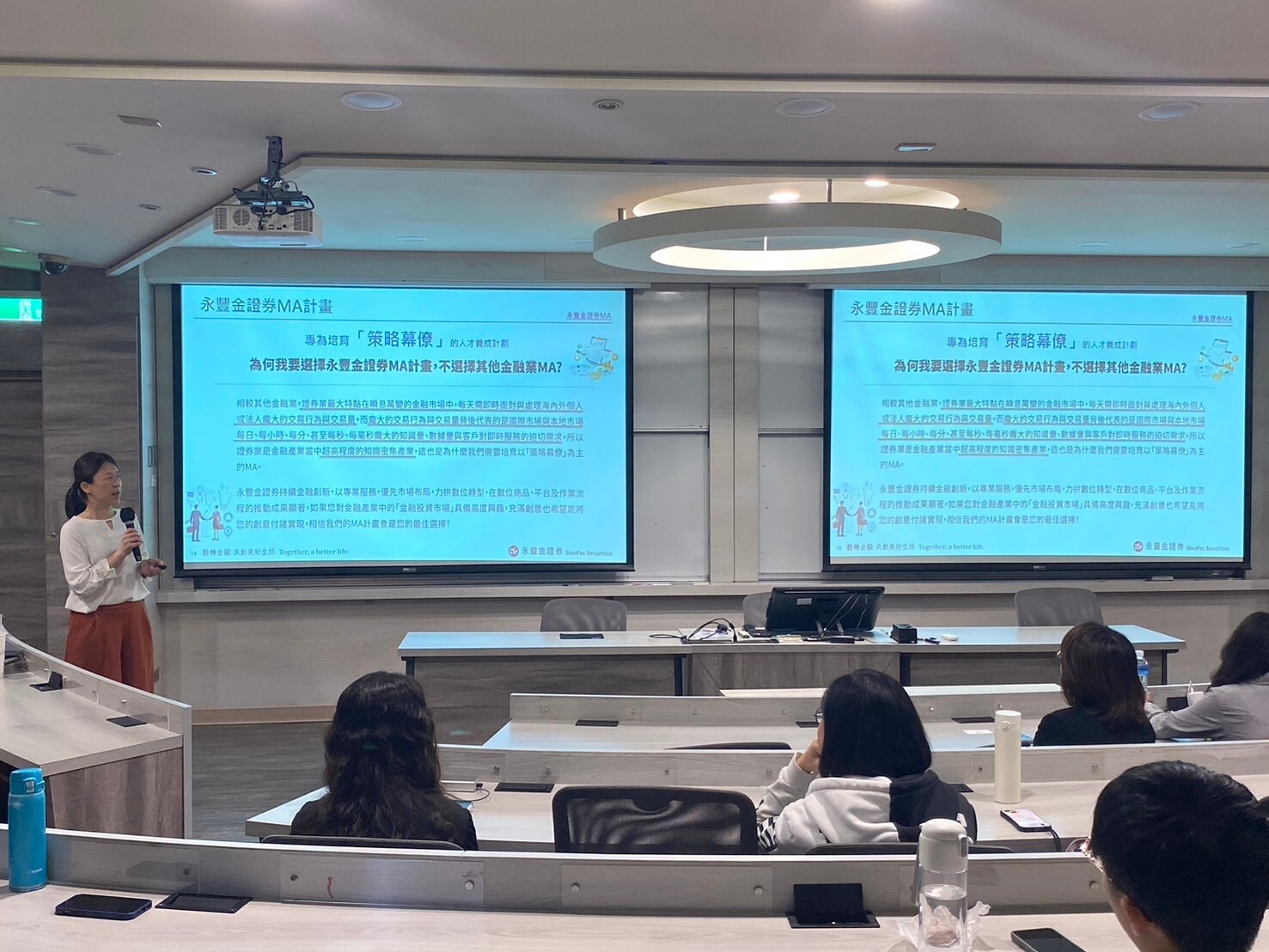 緊接著,中山校友—經濟學研究所畢業,現任職於數位金融處行銷企劃部的陳俐維學姊,分享自己當上永豐金證券MA的歷程與收穫。俐維學姊首先告訴同學,MA職位總是被誤會成難如登天,但其實不如一般人所想的難以觸及,就像其他職業一樣,只要對MA有興趣,不管是誰都能投遞履歷;只要有能力,不管是哪家企業都可能錄取。