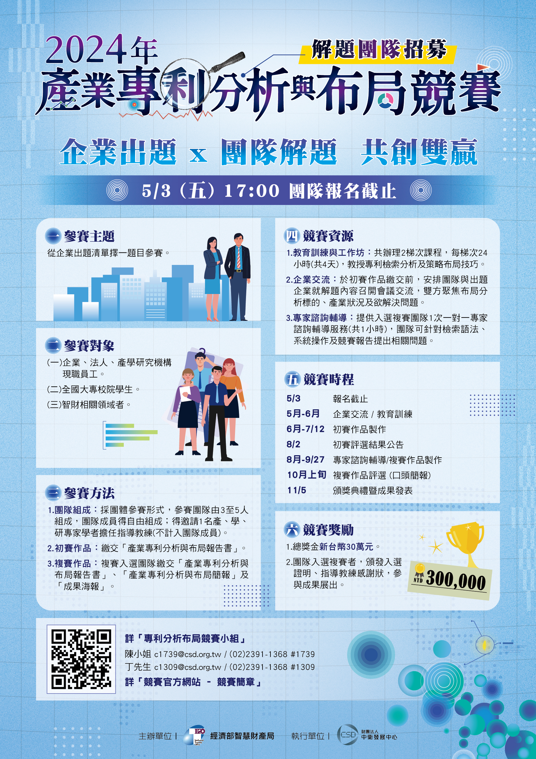 四、本競賽即日起至113年5月3日下午5時止受理報名,歡迎有 興趣的從業人員與學生踴躍報名。詳細資訊與線上報名請至競賽活動網站: https://gpss.tipo.gov.tw/gpsskm/competition2024/