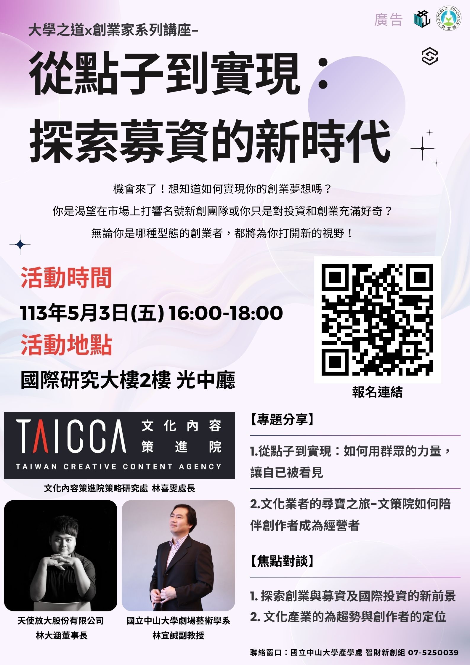 我們邀請了天使放大股份有限公司的林大涵CEO、文策院的策略研究林喜雯處長,還有中山大學的劇場藝術系林宜誠副教授!他們將分享最新的募資趨勢、創業資源,還有獨門秘訣!🔥