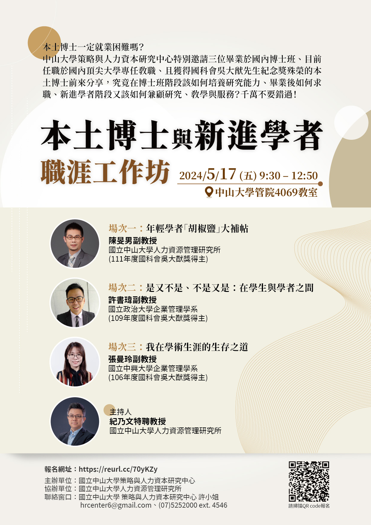 【策略與人力資本研究中心】本土博士與新進學者職涯工作坊(5/17)