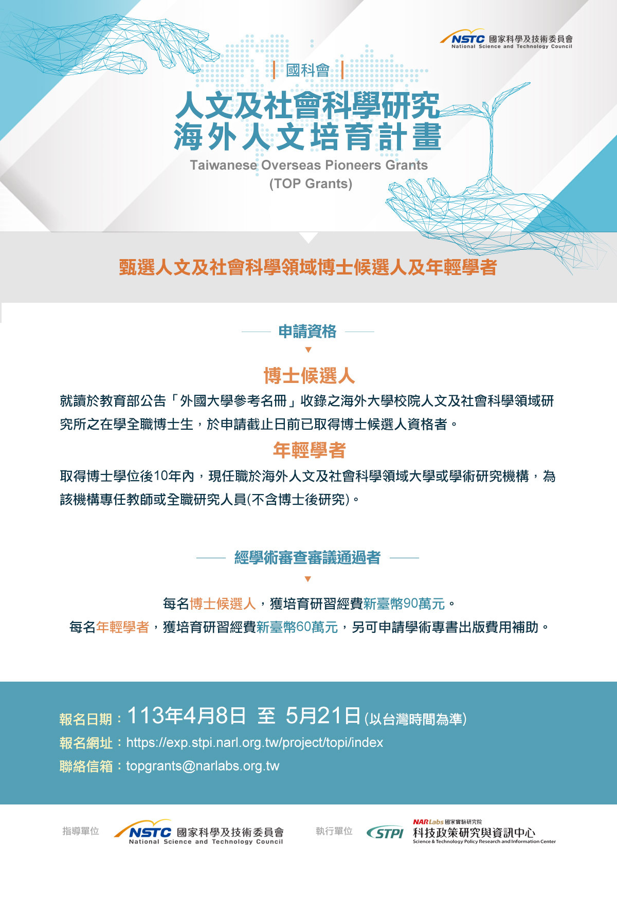 國家科學及技術委員會推動「人文及社會科學研究海外人才培育計畫(TOP Grants)」,旨在培育及支持目前在海外就學或工作的人文及社會科學領域優秀博士候選人及年輕學者。我們誠摯邀請您協助推薦符合申請資格的優秀人才,共同為臺灣人文及社會科學研究的發展貢獻心力。