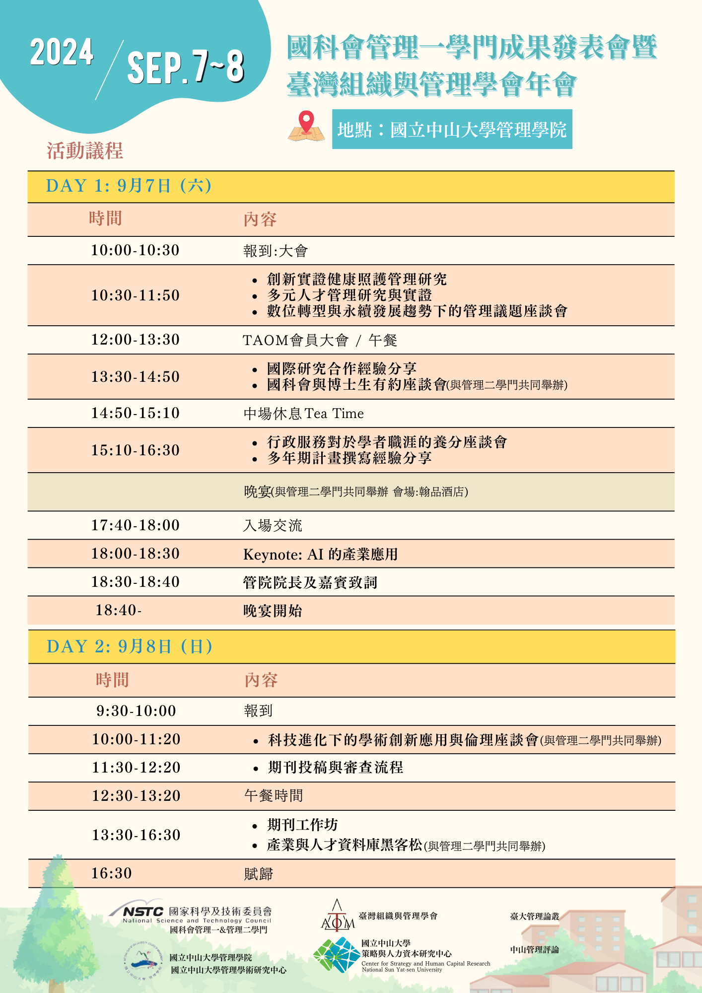 2024國科會管理一學門成果發表會暨臺灣組織與管理學會年會(TAOM)將在 2024年9月7日至9月8日兩天於國立中山大學管理學院舉辦。期待透過各界先進學者的分享以及互動討論,共同激發管理一學門研究議題未來的前瞻研究趨勢。