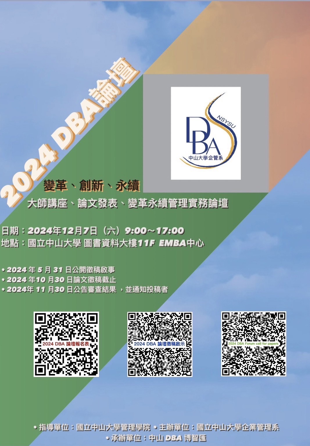 國立中山大學DBA(Doctor of Business Administration),本著追求創新的精神、國際化視野,致力於建構一個學術與實務融合的平台,以發展可實踐的智慧與經驗,成為社會經濟永續發展之基石。源於此初衷,而舉辦DBA論壇,希望促進跨校、跨界的相互交流及多元學習。由於外在環境瞬息萬變,從科技的快速發展到社會環境永續的倡議,使得企業充滿挑戰,同時也存在機會。論壇以「變革、創新、永續」為主題,希望匯聚各方智慧,探討如何在快速變化的市場中啟動變革轉型與創新,以提升企業競爭力,並探討如何在經營中實現永續發展,為企業的未來提供新思路和新動力。