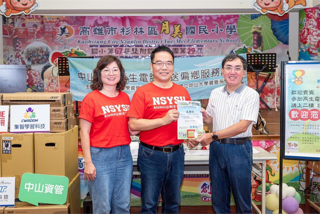 左圖:國立中山大學資管系友會會長施富川(中)引領系友會籌辦「再生電腦愛送偏鄉」活動,右為月美國小邱怡和校長。