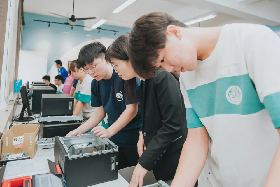 資管系同學們「大手牽小手」,指導壽山國中國中生整理再生電腦。