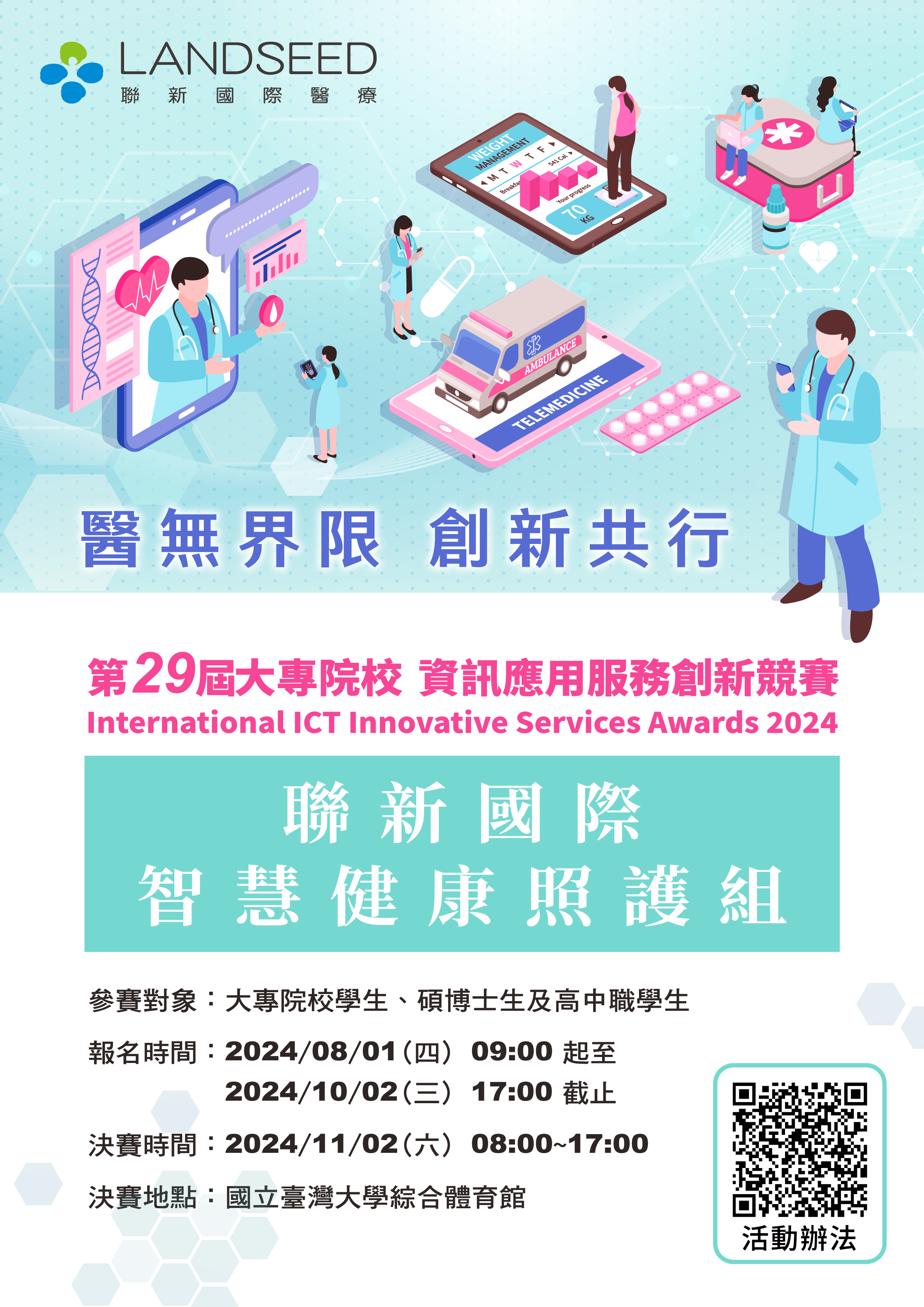 - 詳細競賽辦法請參閱活動官網:https://innoserve.tca.org.tw/advertise24_Landseed.htm。