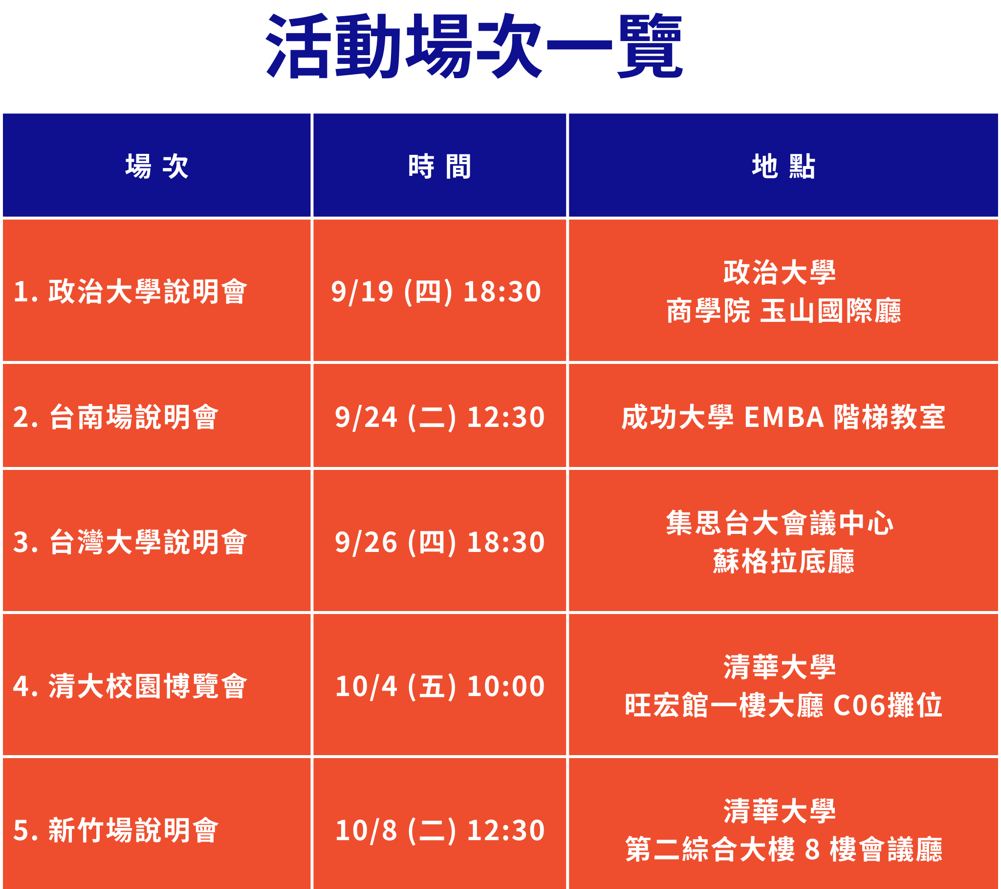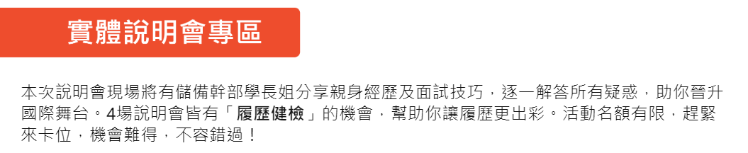 9~10 月招募團隊將前進北中南各大校園辦理說明會,除了瞭解詳細資訊,還有儲備幹部經驗分享喔!