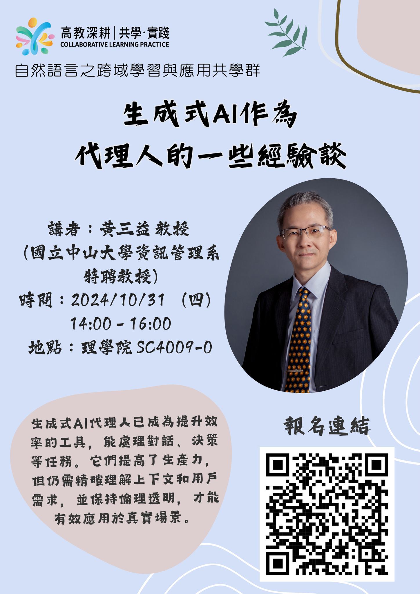 【自然語言之跨域學習與應用共學群】生成式AI作為代理人的一些經驗談 講者:黃三益教授(10/31)