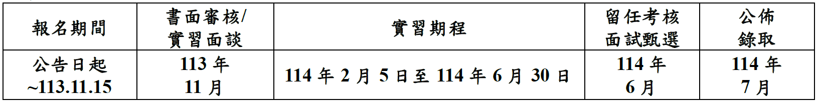 【實習期間】114. 02. 05 - 114. 06. 30,每週二至週五 08:50~17:00(含休息時間 0.5 小時)