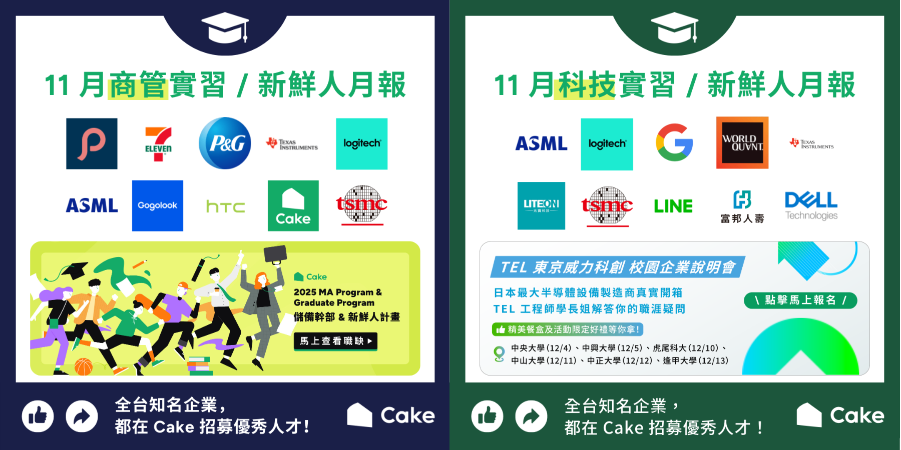 【職涯】Cake獨家實習/新鮮人職缺資訊分享 |11 月商管/科技職缺月報