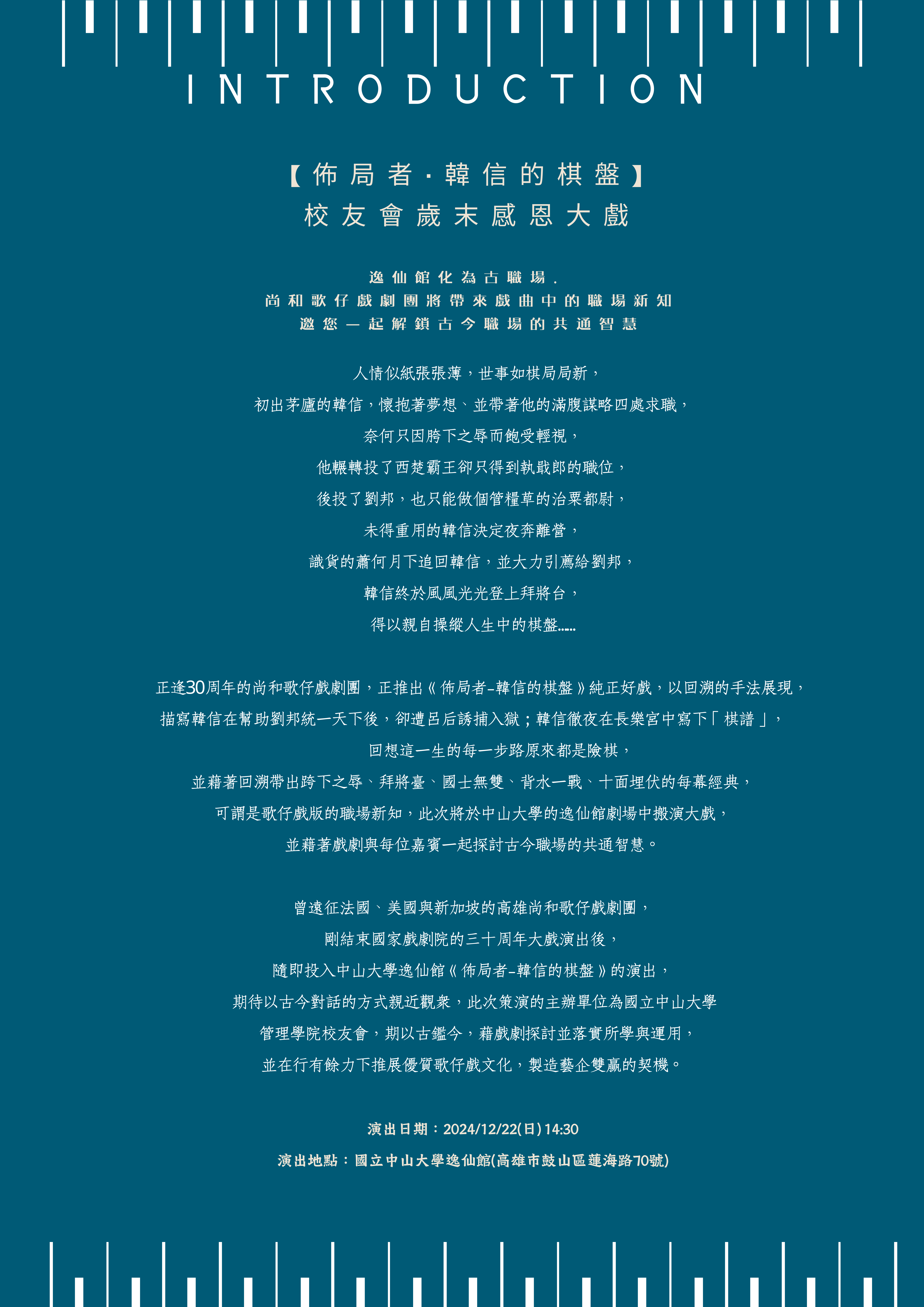由後EMBA學長姐共同贊助演出的歲末感恩大戲,歡迎學長姐邀請您的家人朋友共襄盛舉!