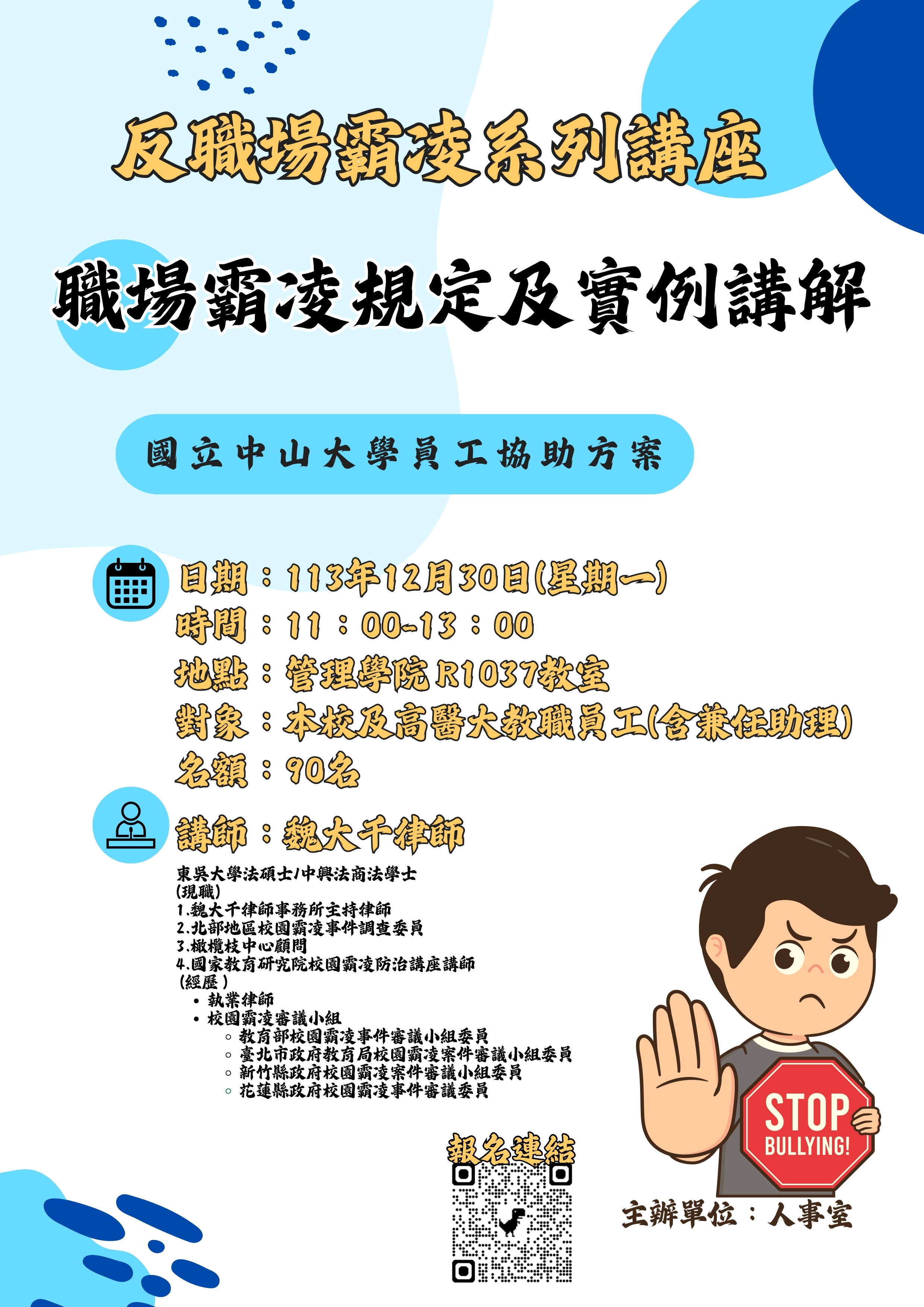 (二)第二場次:職場霸凌規定及實例講解 1、講師:魏大千律師 2、日期:113年12月30日(星期一)3、時間:11:00-13:00 4、地點:本校管理學院 R1037教室 5、本校及高醫大教職員工(含兼任助理) 6、名額:90名。 7、報名方式:請填列下列報名表單 :https://forms.gle/i27QZL6V3Ar5TxKq7 8、報名期限:自即日起至113年12月25日(星期三)或額滿為止。 9、本場講座活動備有餐盒,敬請依限完成報名程序,以利備餐。