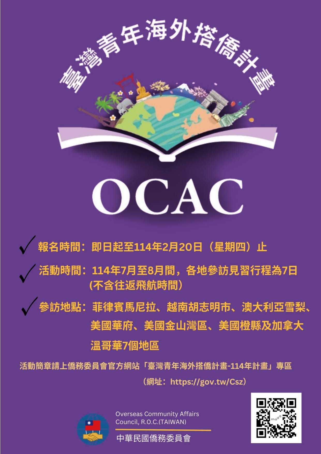 【僑務委員會】「114年臺灣青年海外搭僑計畫」申請資訊(2025/2/20截止)
