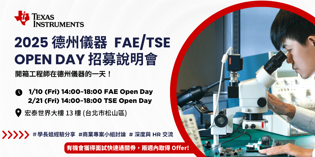 【徵才】德州儀器 FAE、TSE Open Day 招募說明會(1/10、2/21)