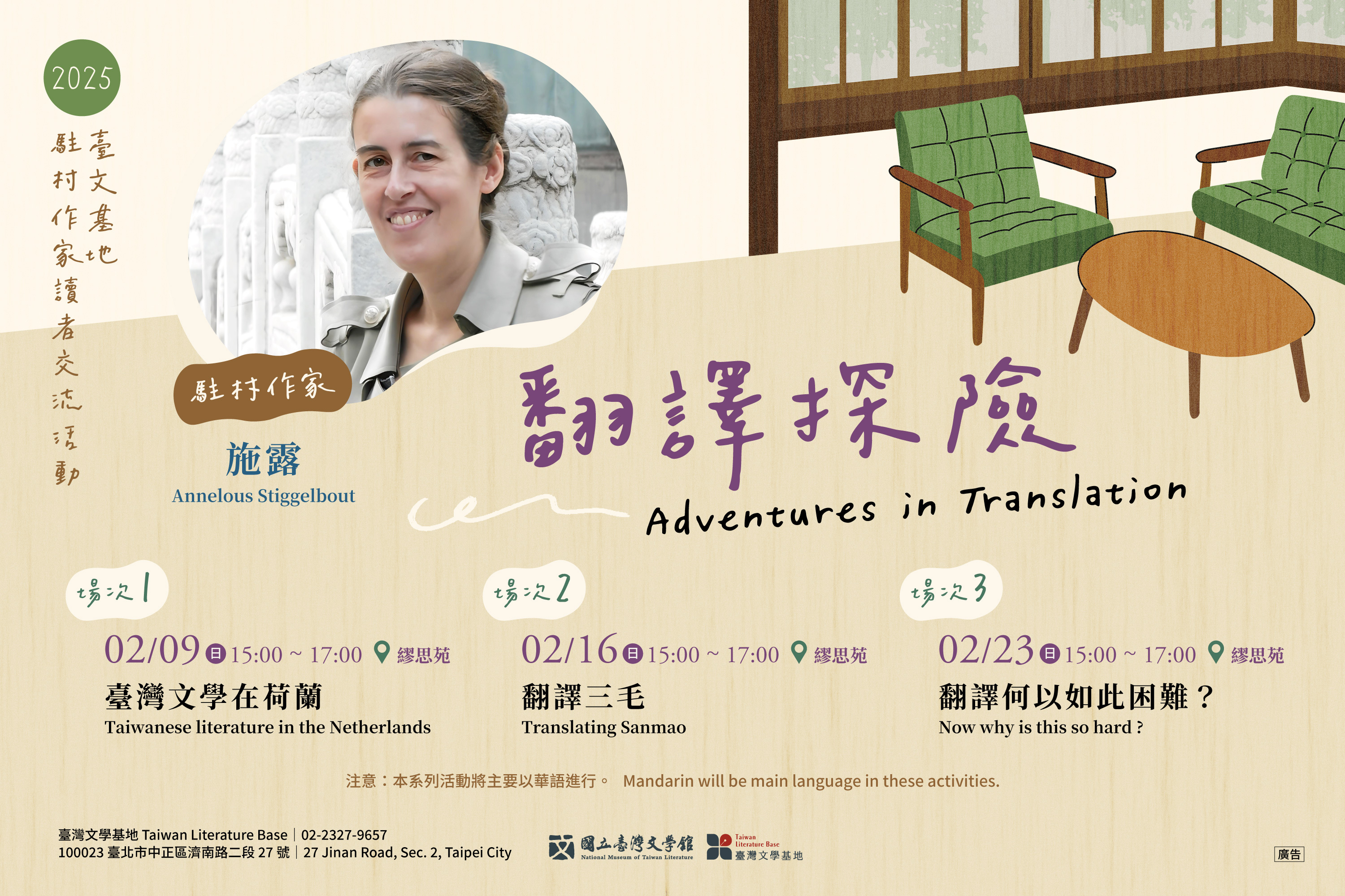 #Dutch translator #Annelous_Stiggelbout, who translated #Sanmao's Stories of the Sahara into Dutch, will share her experiences through a series of three sessions titled #Adventures_in_Translation during her residency. She will discuss the joys and challenges of working in translation. You are warmly invited to join us at the #Taiwan_Literature_Base this February, when spring is in the air, to explore the vitality of literary translation as it reaches out into the world.