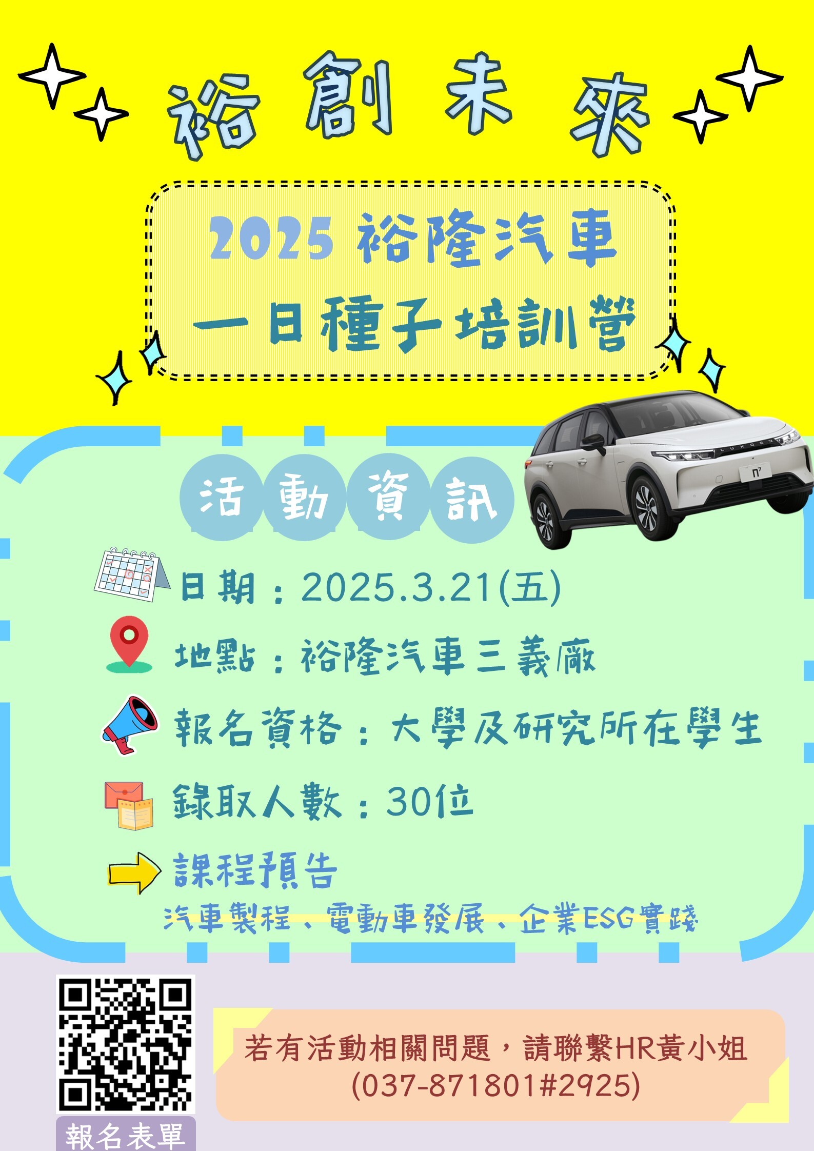 2. 若對此活動有任何問題,歡迎洽詢037-871801 分機2925(裕隆汽車/黃小姐)