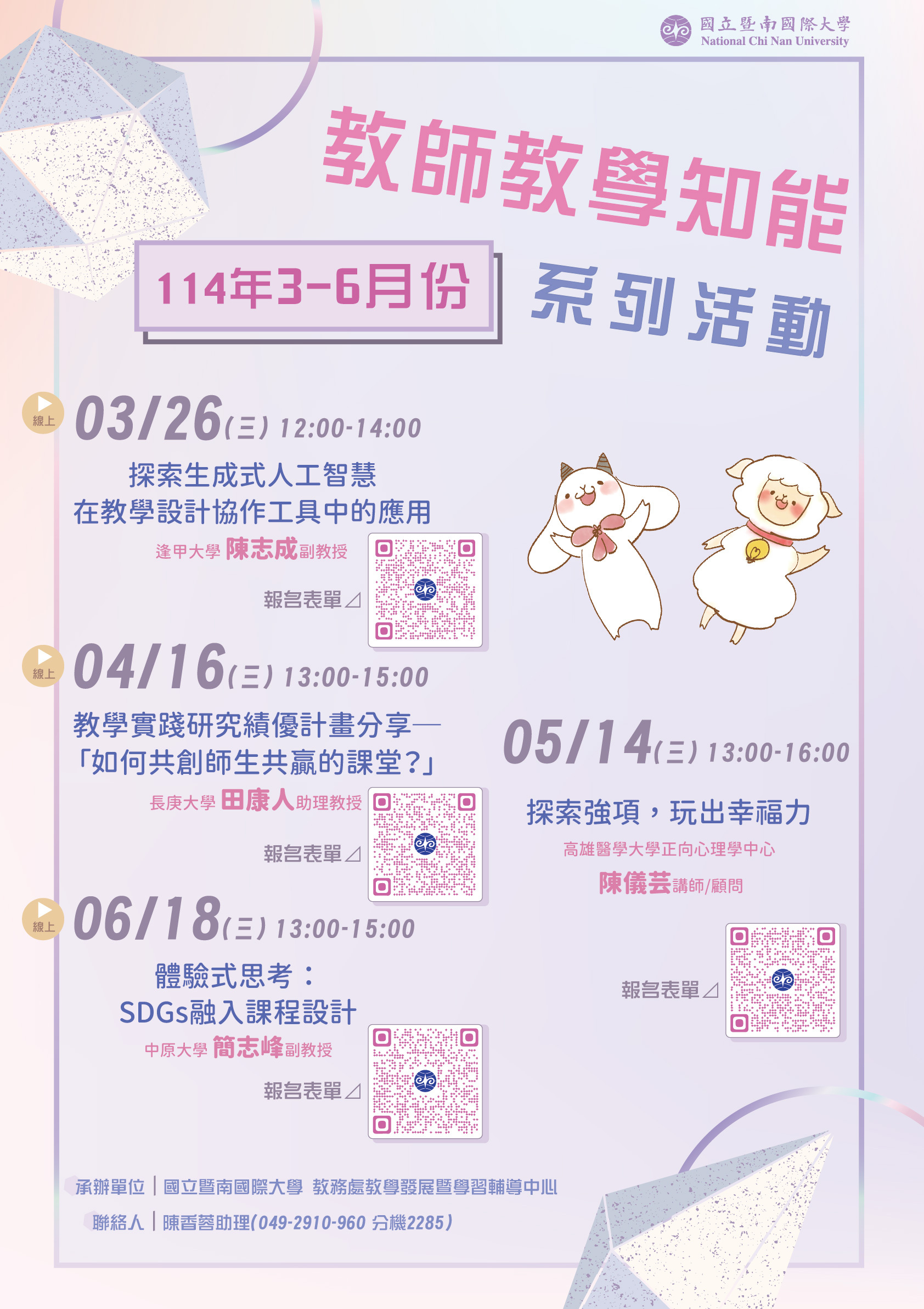 一、因應變化不斷之教學環境與新興科技的快速變遷,國立暨南國際大學教學發展暨學習輔導中心規劃於114年3~6月份辦理共計4場「教師教學知能系列活動」,希冀協助教師提升教學品質及激盪邏輯思維能力。