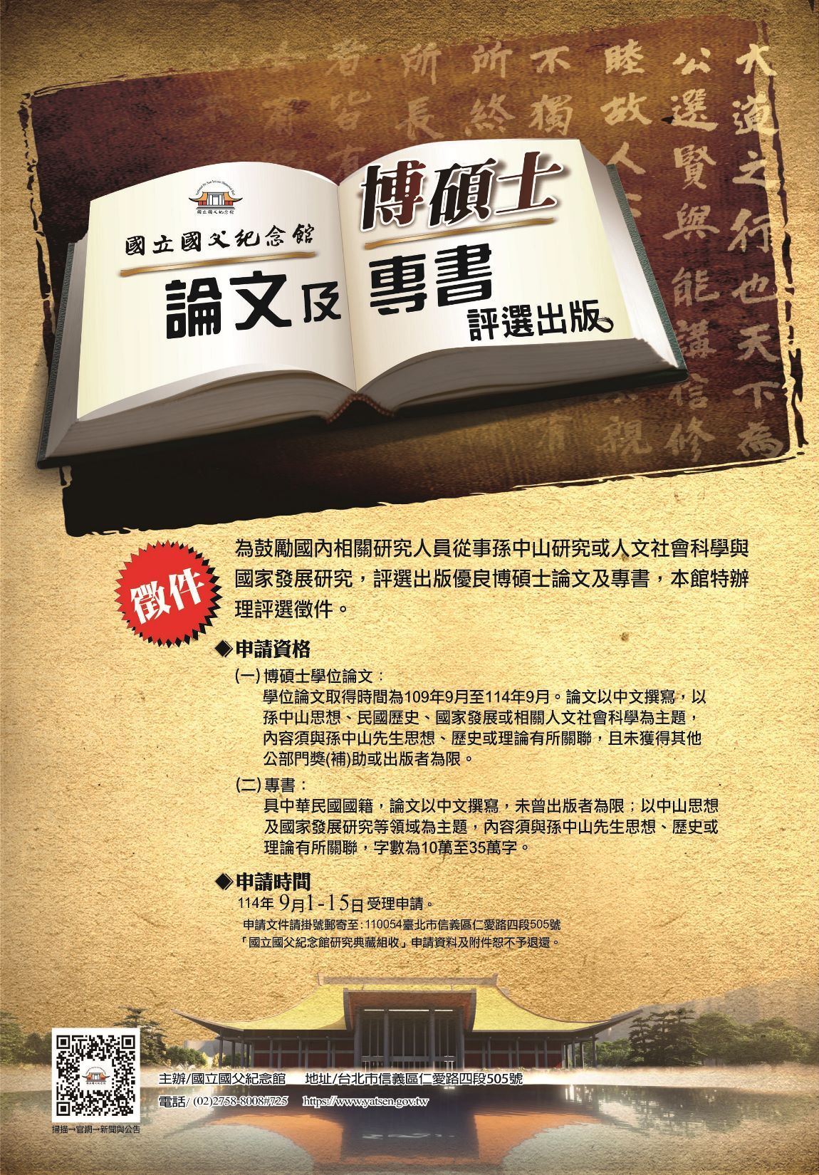 【國父紀念館】「114年國立國父紀念館評選出版博碩士論文及專書」實施計畫(9/15截止)
