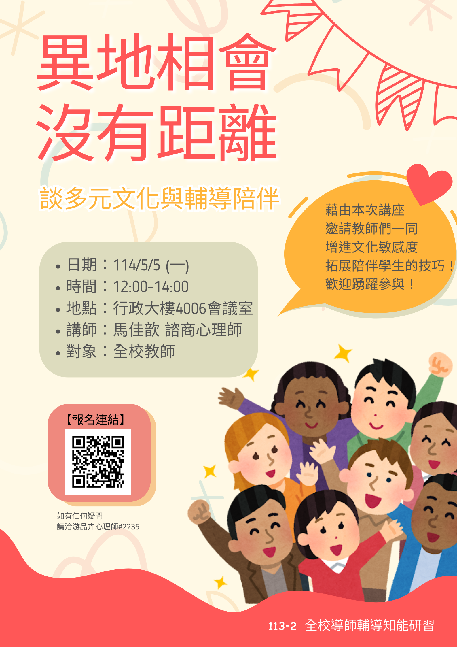 【中山】【113-2全校導師輔導知能研習:異地相會,沒有距離—談多元文化與輔導陪伴】歡迎踴躍報名! " Walking Together: Multiculturalism and Support in Counseling"