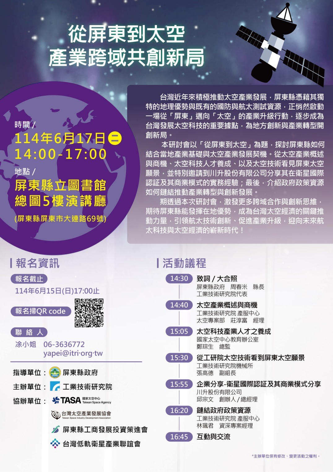 【屏東縣政府】從屏東到太空 產業跨域共創新局研討會(6/17)