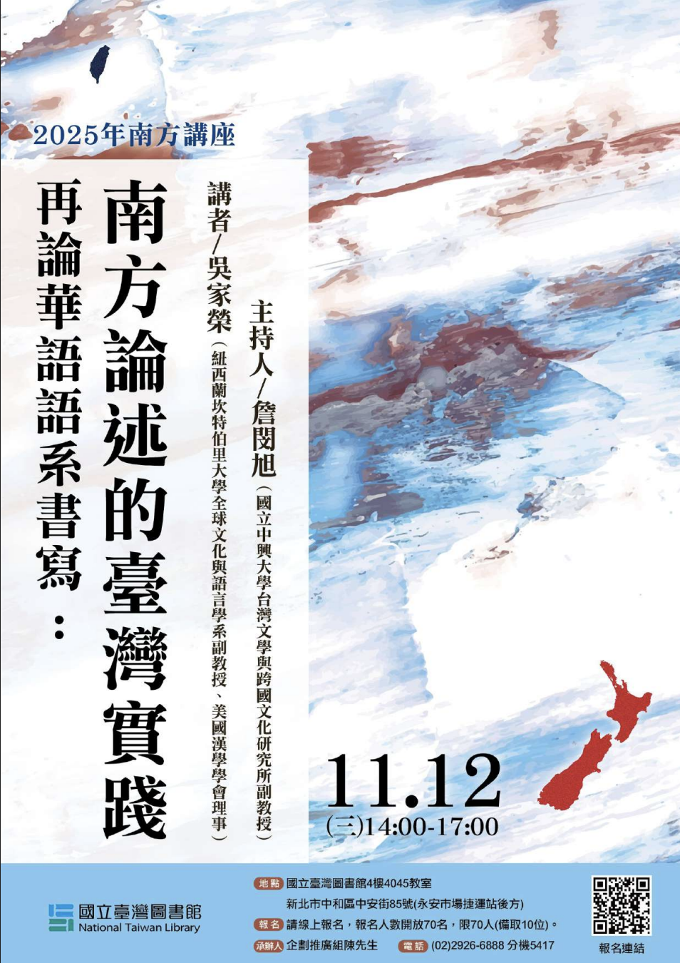 國立臺灣圖書館謹訂於114年9月30日(星期二)及同年11月12日辦理旨揭講座(詳如附件1、2),自9月1日(星期一)起開放線上報名,錄取名單將陸續以電子郵件通知。請至國立臺灣圖書館臺灣學研究中心(https://wwwacc.ntl.edu.tw/mp.asp?mp=5 ) 「講座研習」中「講座」項下,或連結附件之電子DM中 QRcode報名。相關活動資訊請電洽(02)2926-6888#5417陳先生。