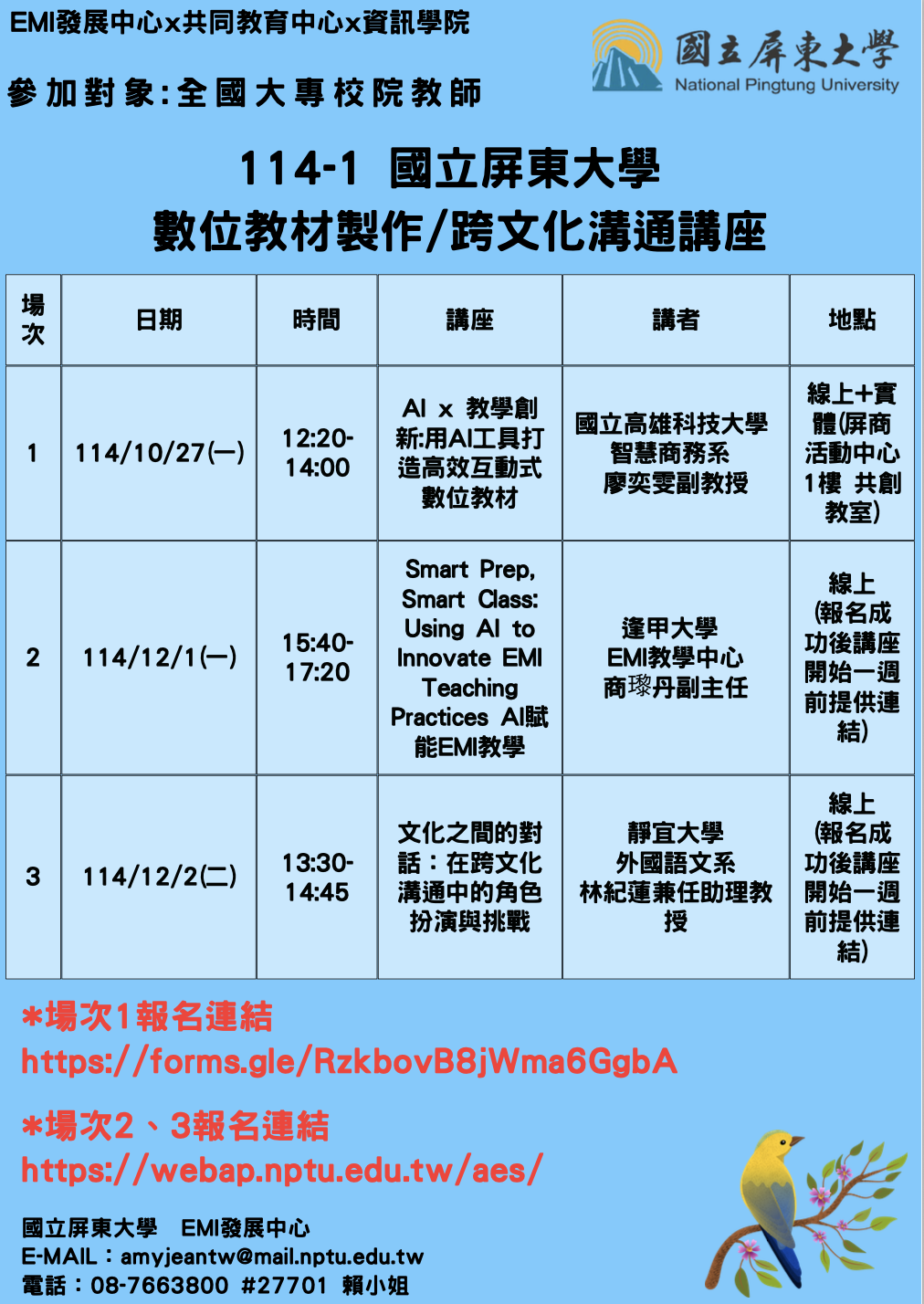 【屏東大學】 114學年度第1學期「數位教材製作」與「跨文化溝通」系列講座