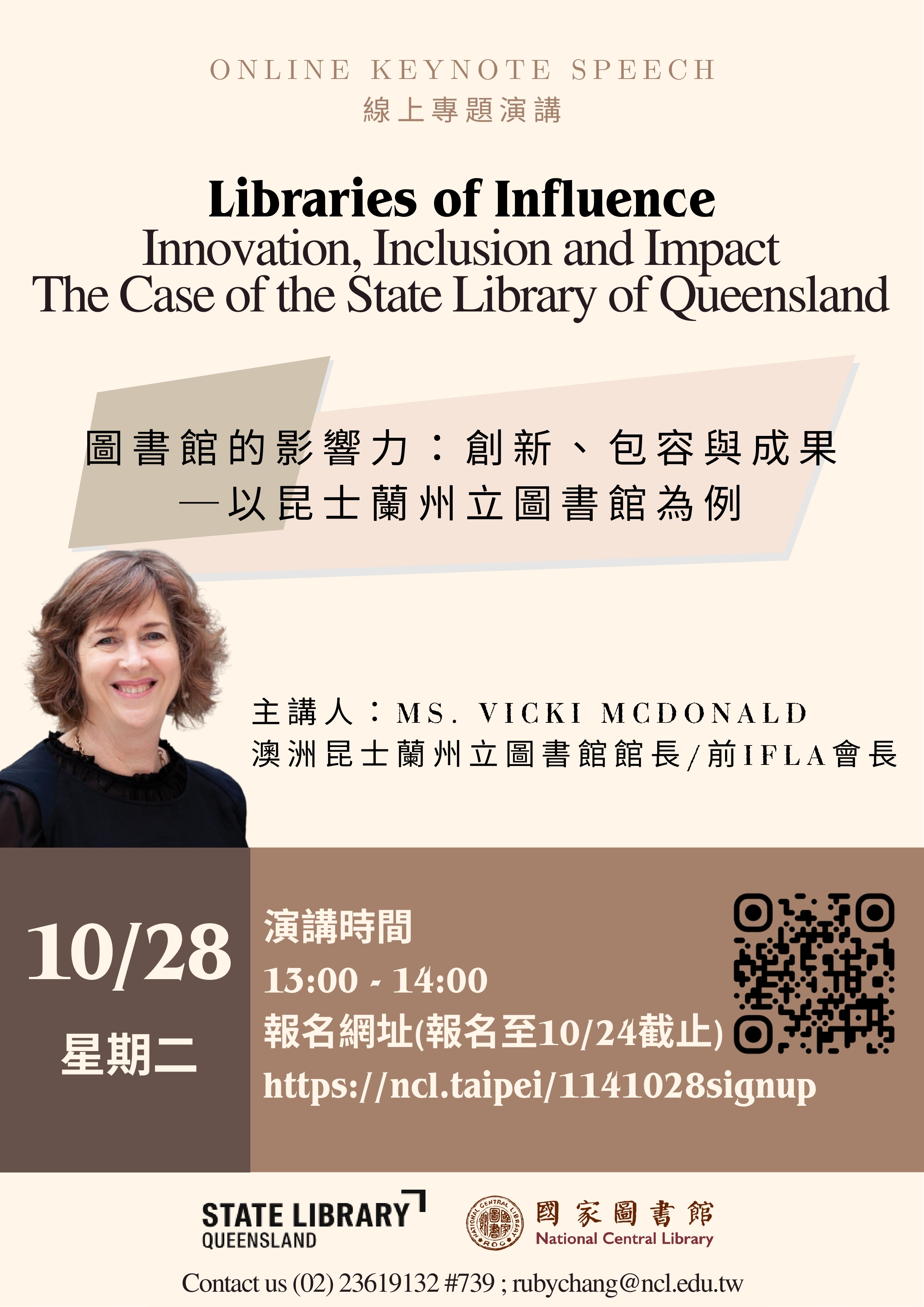 一、國家圖書館為促進國內圖書館國際交流,增進館員掌握國際圖資發展趨勢動脈,訂於本(114)年10月28日(星期二)下午1時至2時,邀請旨揭館長以「圖書館的影響力:創新、包容與 成果─以昆士蘭州立圖書館為例」為題進行線上演講與交流。