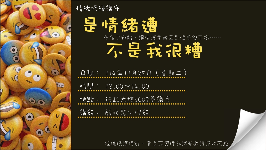 【中山】教職員工限定~情緒修練講座:是情緒遭 不是我很糟 Faculty & Staff Only Workshop – Emotional Training: “It’s the Emotion That’s Bad, Not Me”(11/25)