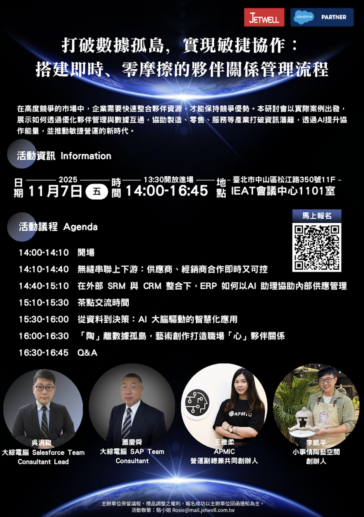 本次講座將透過實戰案例,深度解析 AI 如何優化夥伴管理與數據互通,協助製造、零售、服務等產業, 打破資訊藩籬,全面升級為「全鏈流程管理」與「敏捷營運」!