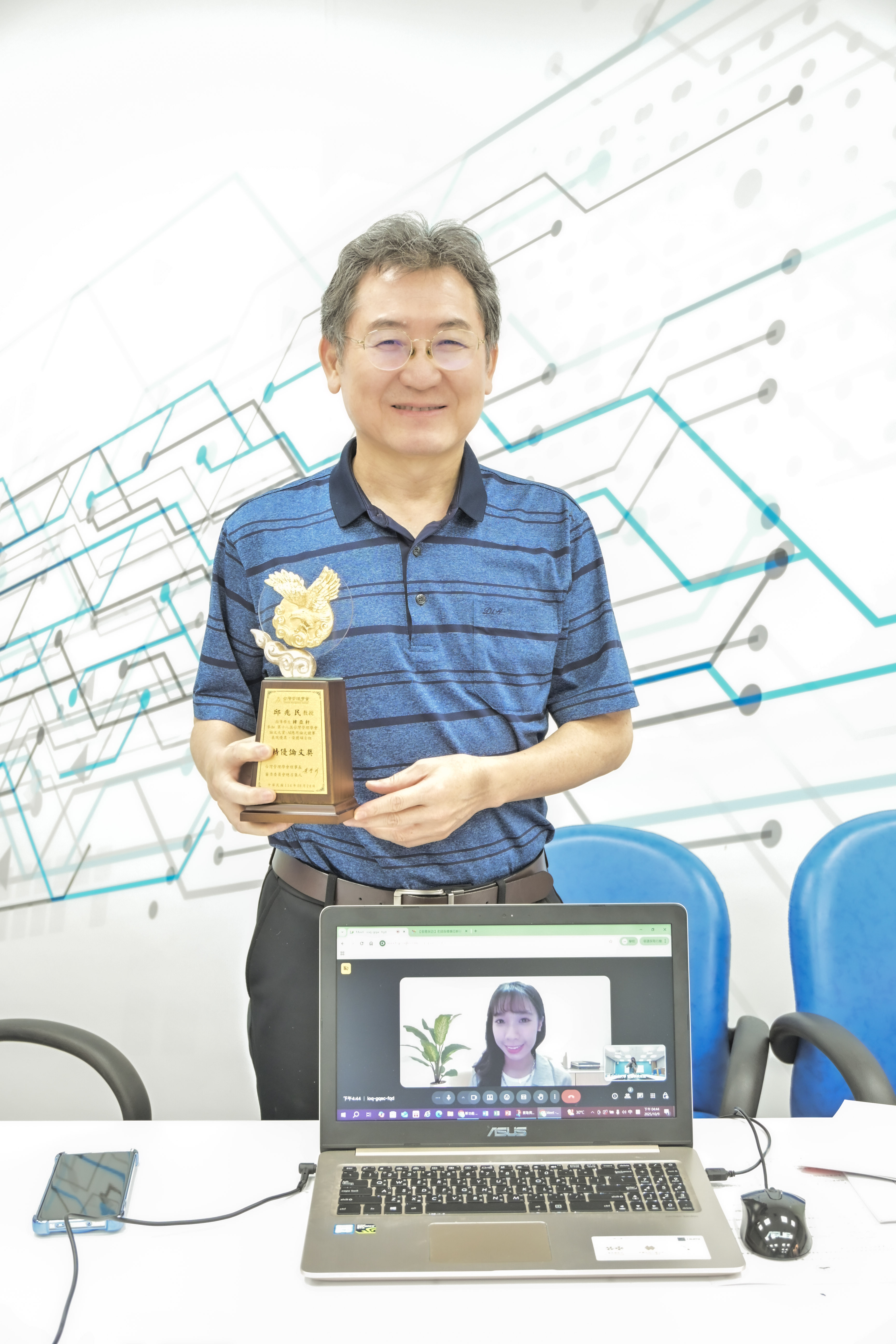 因採訪當天邱兆民教授與韓亞軒同學無法同時出席,韓亞軒特別合成照片,與老師共享榮耀。