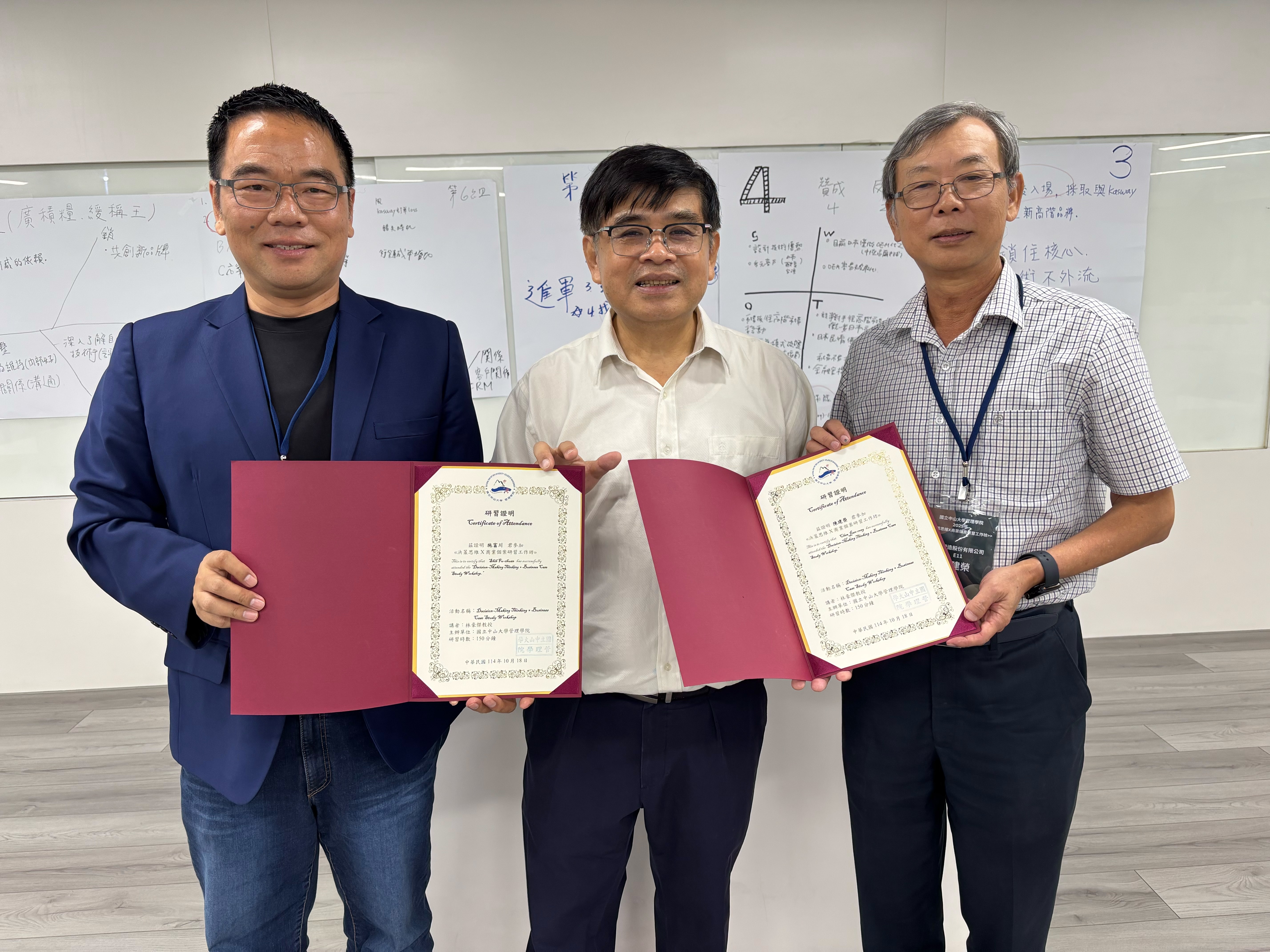 由院長頒發予2位傑出校友施富川學長(左)、陳建榮學長,代表此次參加工作坊的校友們受贈研習證明。