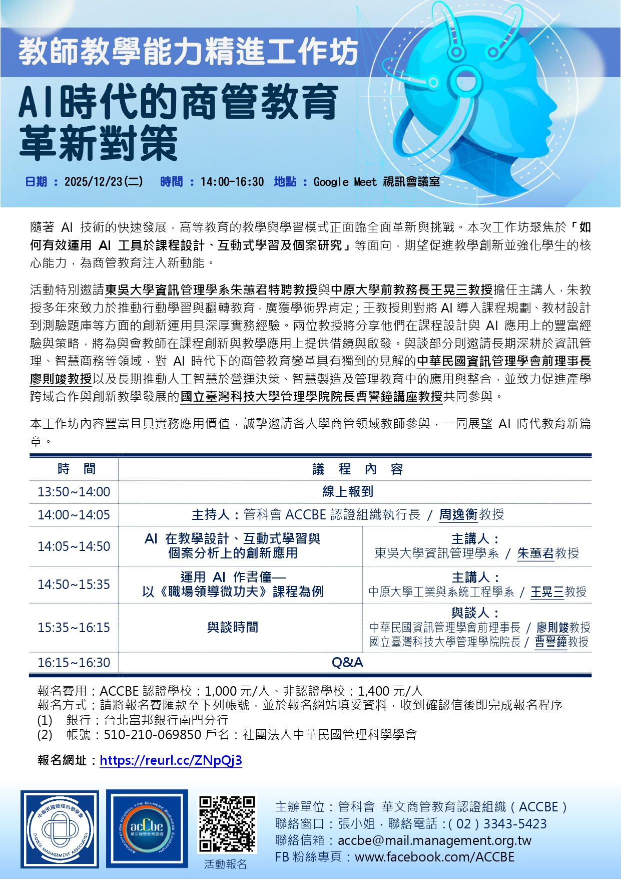 二、本會將於今(114)年12月23日(週二)下午二時至四時三十分舉辦「教學能力精進系列工作坊 — AI時代的商管教育革新對策」,邀請在AI應用與教學創新方面具深厚經驗的教育專家——東吳大學資訊管理學系朱蕙君特聘教授與中原大學前教務長王晃三教授——分享他們的教學實踐與策略。