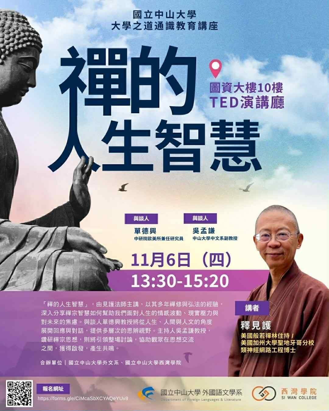 「禪的人生智慧」,由見護法師主講,以其多年禪修與弘法的經驗,深入分享禪宗智慧如何幫助我們面對人生的情感波動、現實壓力與對未來的焦慮。與談人單德興教授將從人生、人間與人文的角度展開回應與對話,提供多層次的思辨視野。主持人吳孟謙教授,鑽研禪宗思想,則將引領整場討論,協助觀眾在思想交流之間,獲得啟發,產生共鳴。這場講座不僅是一個探討禪思的學術交流,更是一段關於人生態度的智慧對話。透過宗教與人文的交會,與會者將有機會重新思考如何在繁忙與不安中,找到屬於自己的清明、自在與方向。