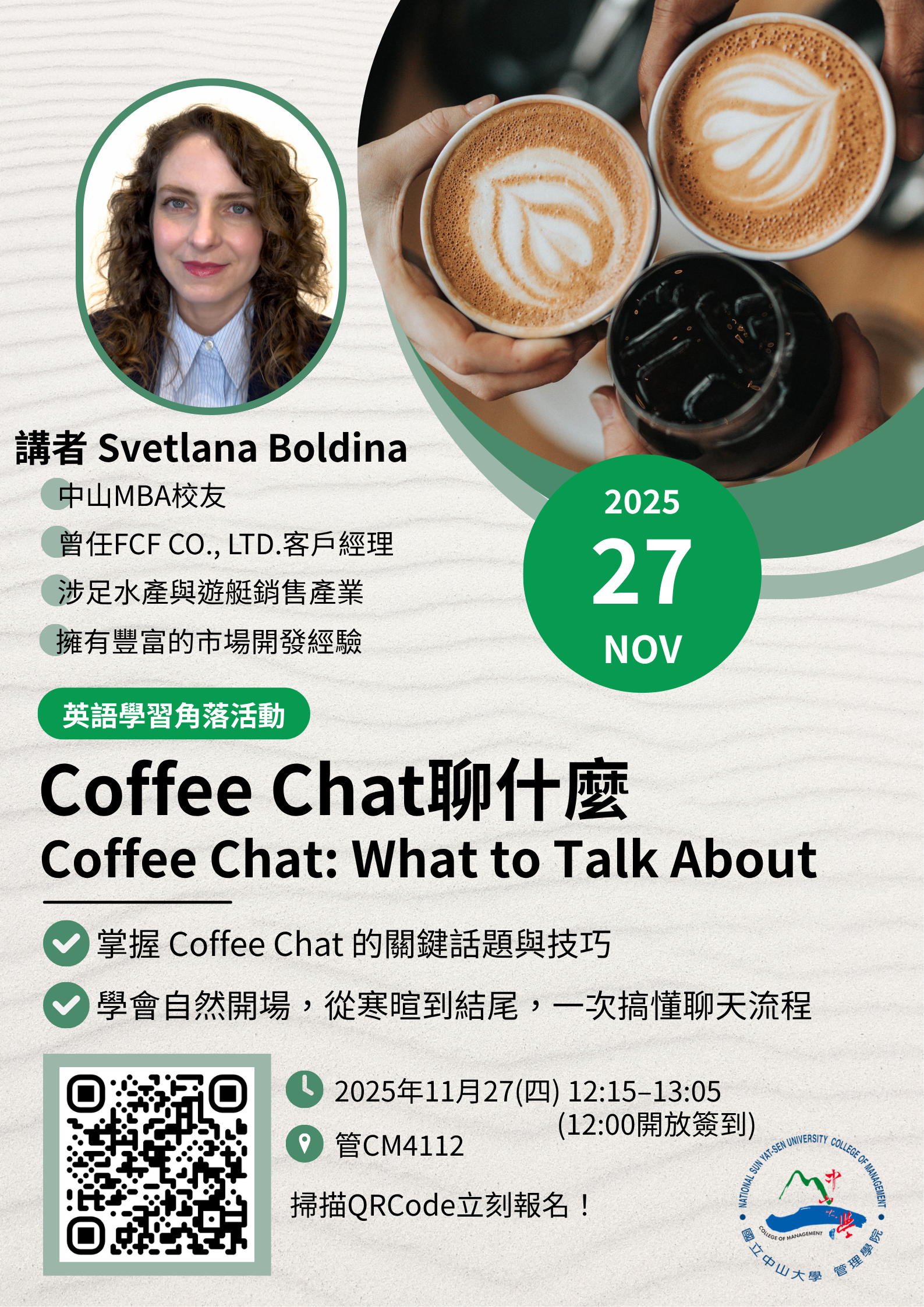 本次講座將帶你掌握 Coffee Chat 的必備技巧——從開場話題、對話流程到結尾收尾,讓你在交流中自然又得體。