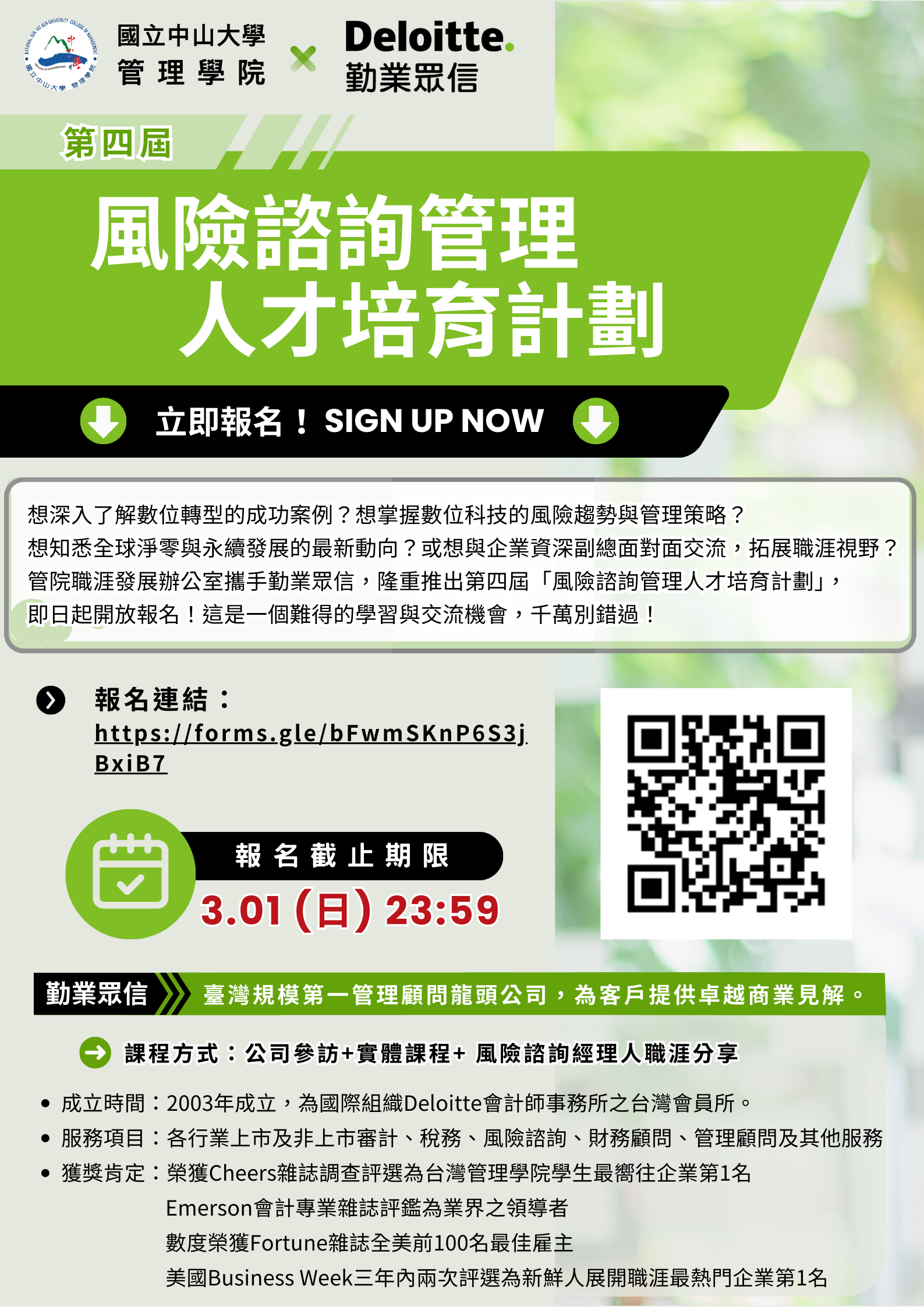 【職涯】立即報名!中山管院 X 勤業眾信 2026 風險諮詢顧問管理培育計劃(3/1截止)