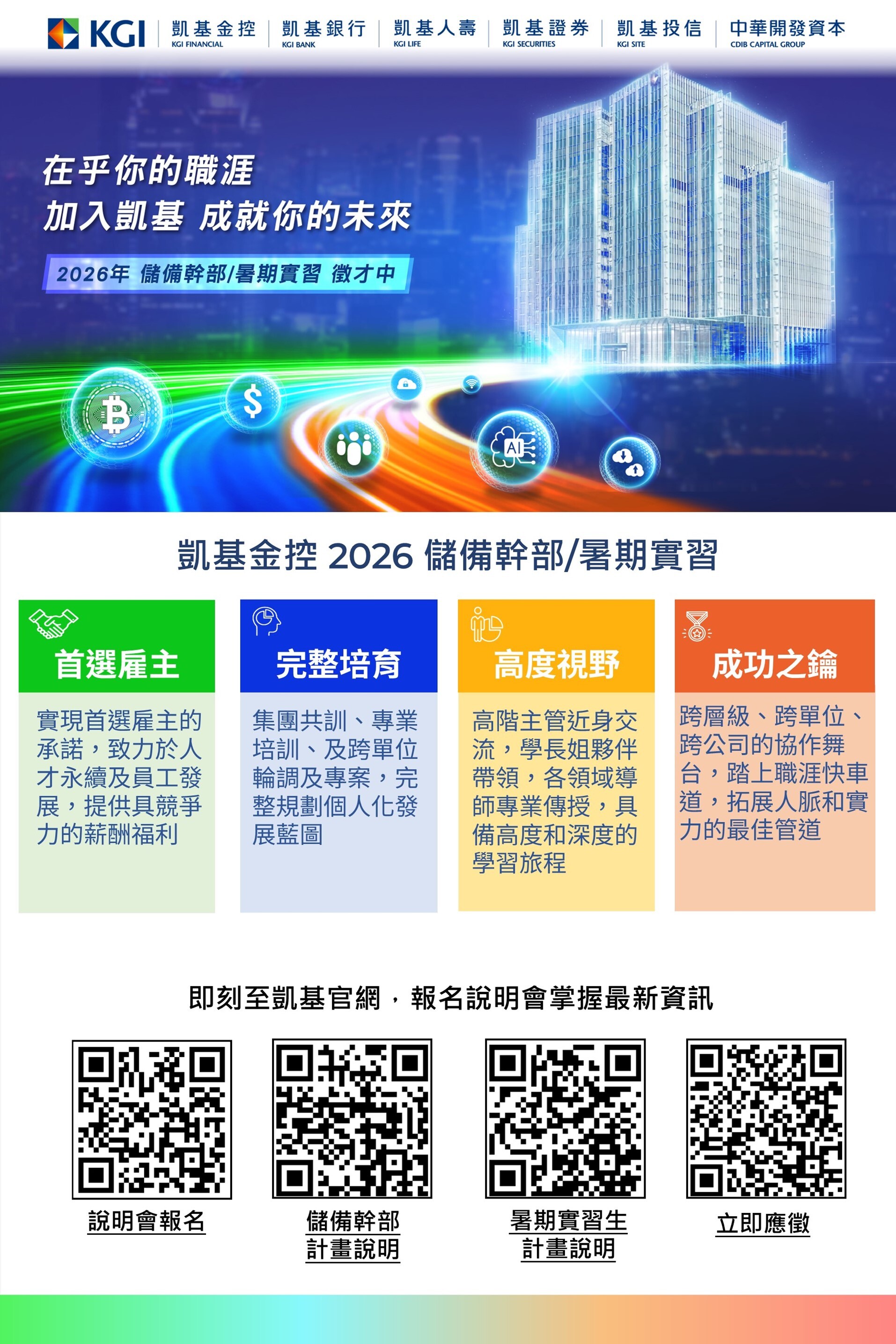 凱基金控與旗下子公司凱基銀行、凱基證券、凱基人壽及中華開發資本,正式啟動 2026 儲備幹部 (MA) 與暑期實習招募計畫