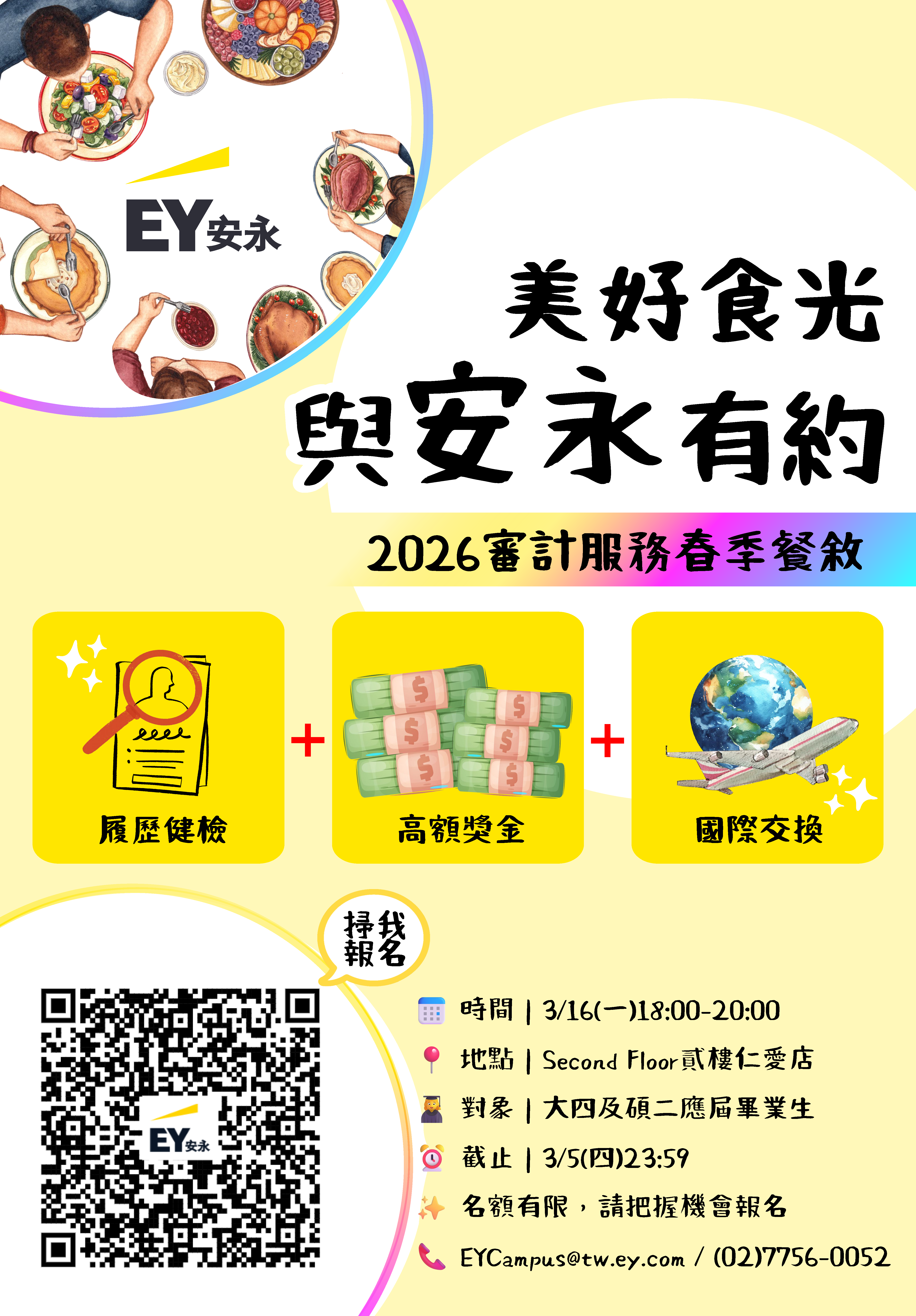 【徵才】安永聯合會計師事務所|2026審計服務春季校園招募餐敘交流(3/05前)