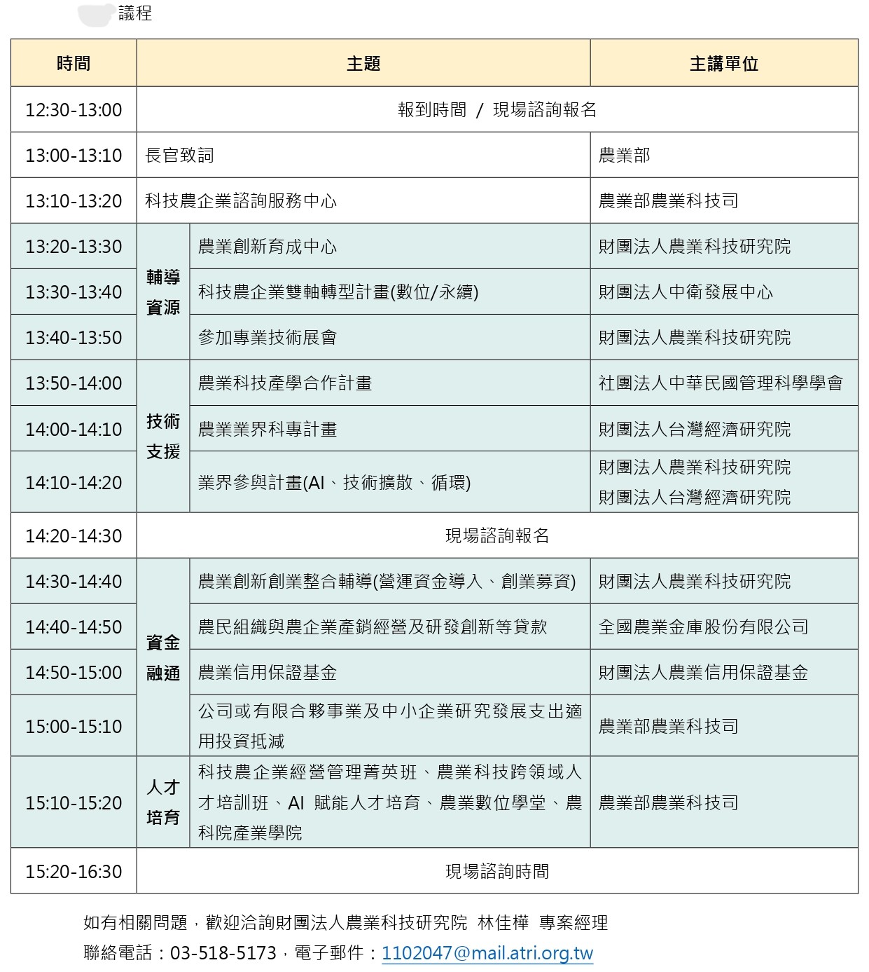 財團法人農業科技研究院林佳樺專案經理 聯絡電話:03-5185173,電子郵件:1102047@mail.atri.org.tw |