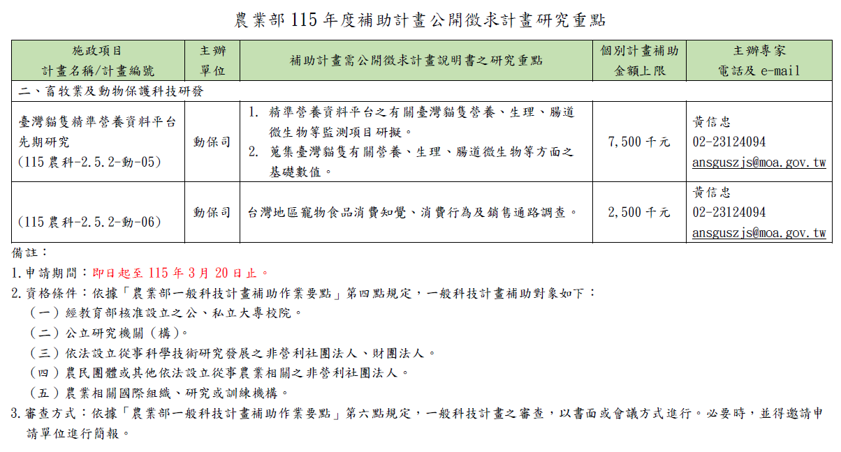 【農業部】115年度補助「臺灣貓隻精準營養平台先期研究」科技計畫(3/20)