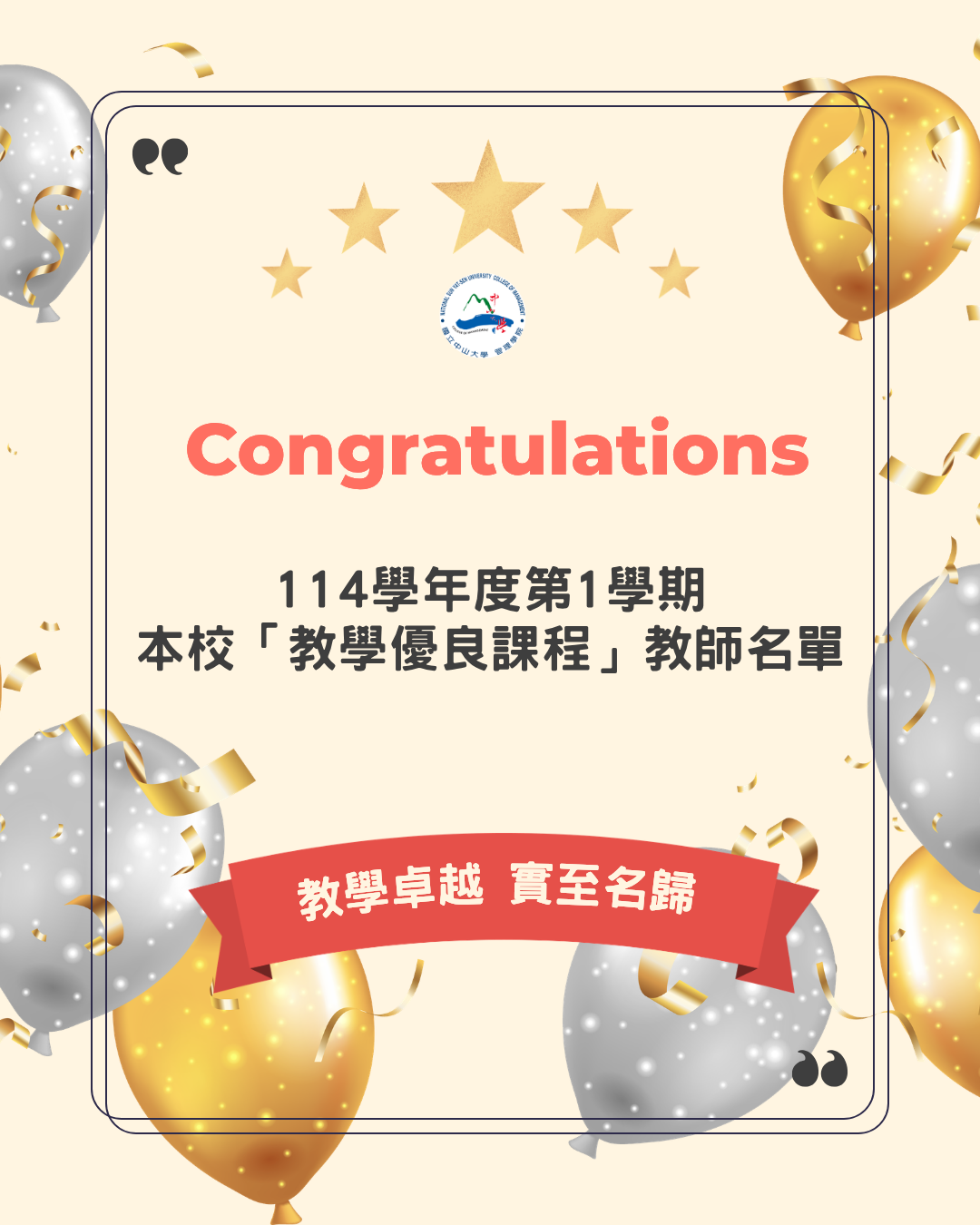 管理學院全體師生同感榮耀,感謝教師們以專業與熱情深耕教學,為學生營造兼具深度與啟發的優質學習場域!