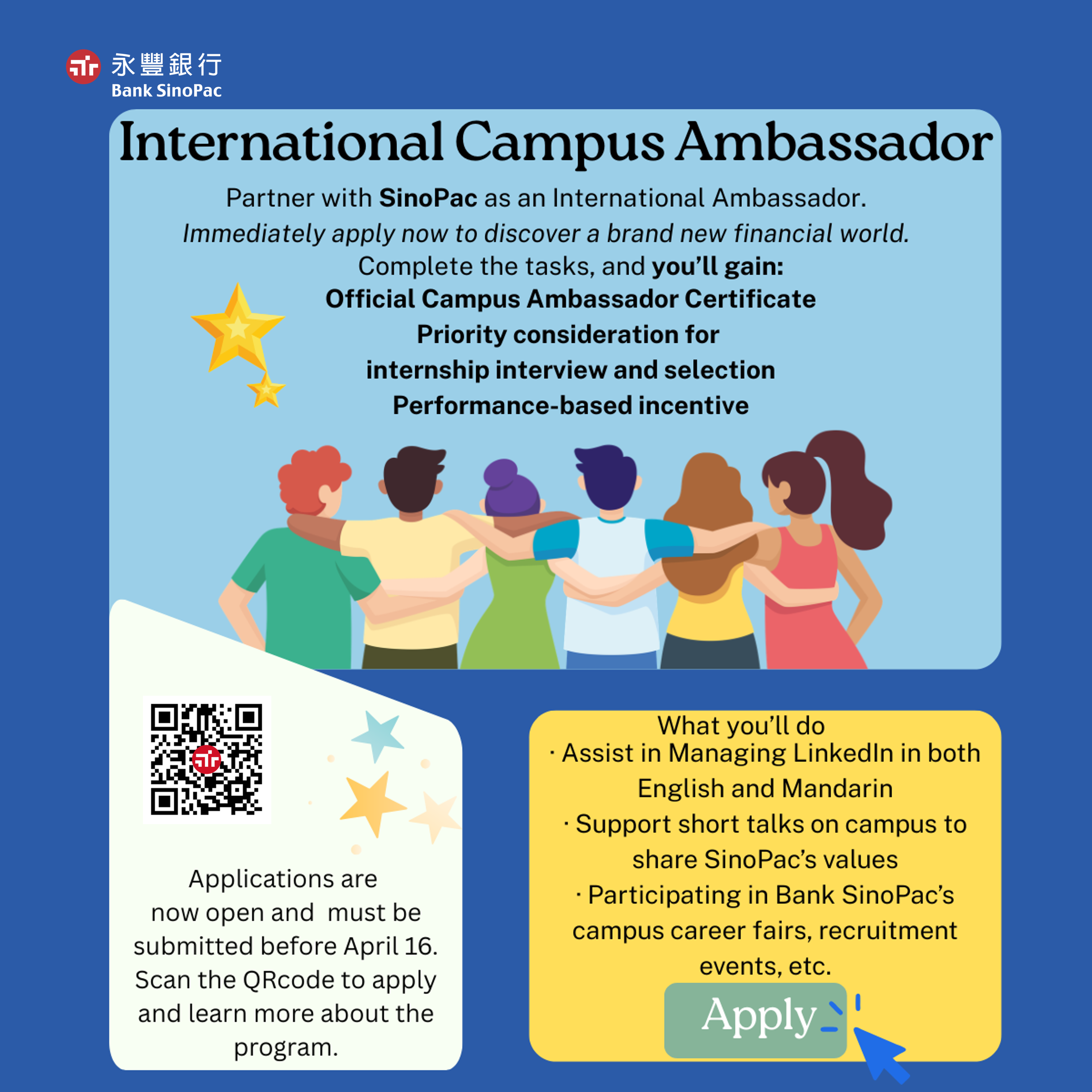 Outstanding ambassadors will gain priority access to SinoPac internship opportunities, including: