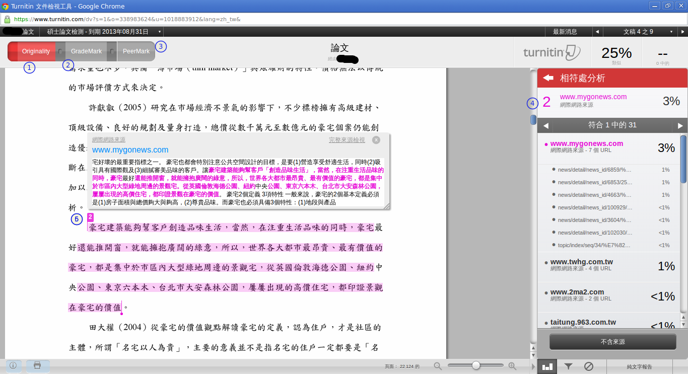 * 比對會列出各樣類似可能的相符處分析,每個分析都會列出來源。可以過濾曾經於他處發表的草稿或是引用的文獻資料來源。