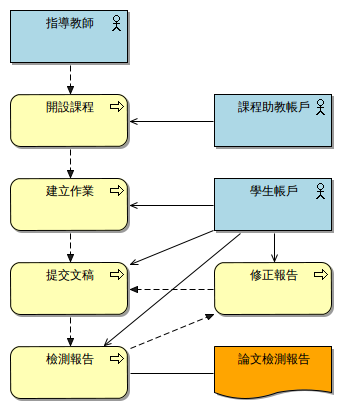 指導老師帳號可以依需要自行開啟課程,課程可以開多個作業,作業可以提供學生上傳繳交文稿的功能。上傳後系統會立即比對,約 5 ~ 30 分鐘即可比對完成並產生文稿的原創性報告。