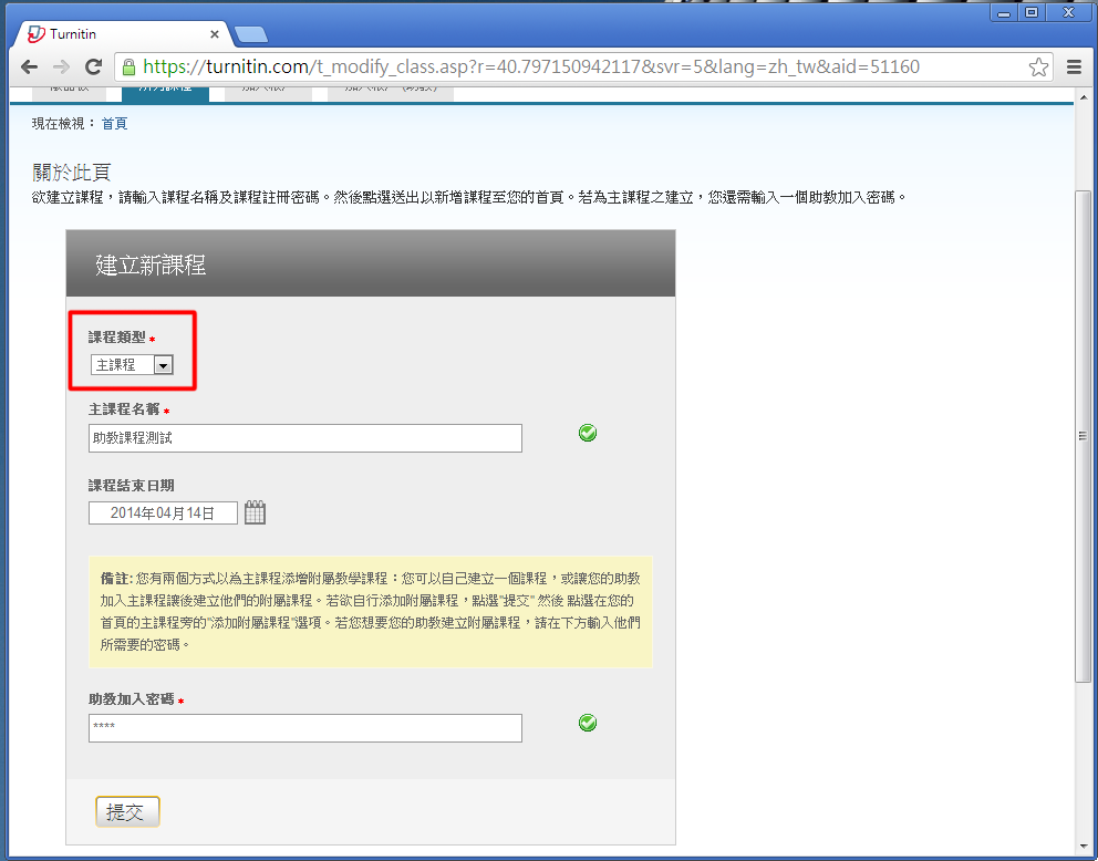步驟二:選擇課程類型為「主課程」、輸入課程名稱,並設定加入密碼。