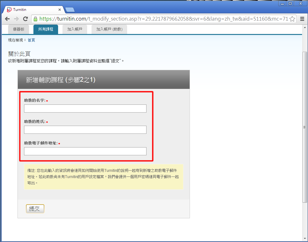 步驟四:點選後會看到如下畫面,依序填入助教的姓名及電子郵件地址。