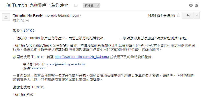 主旨: 一個新的 Turnitin 帳戶已為您建立
