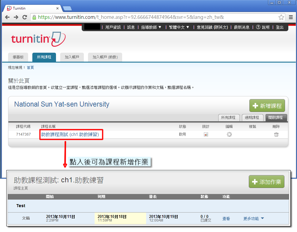 步驟七:助教登入之後會看到以下畫面,此時助教即可編輯課程內容,以及為課程新增作業。